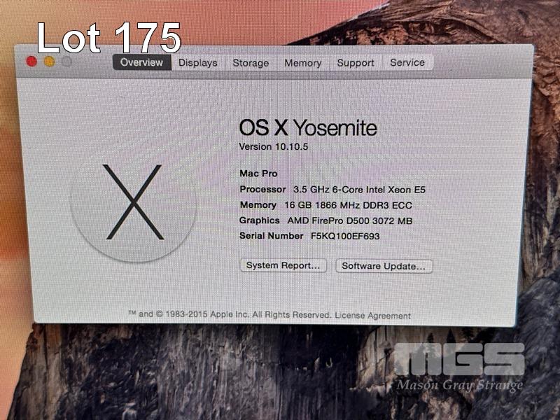 APPLE MAC PRO "CYLINDER" (A1481), XEON E5-1650 v2 @ 3.5GHz, 16GB ECC DDR3 RAM, 256GB SSD, 2 x 3GB AMD FIREPRO D500 VIDEO, Wi-Fi, BLUETOOTH, MAC OS 10.10 INSTALLED (NO CABLE, NO KEYBOARD, NO MOUSE) S/N:F5KQ100EF693
