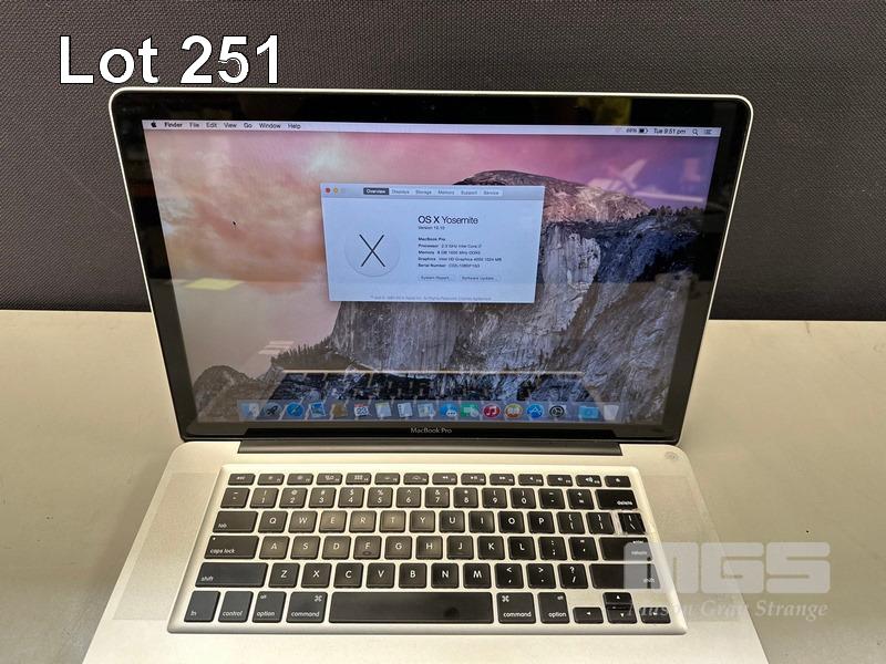 LAPTOP, APPLE MACBOOK PRO (A1286), CORE i7 3615QM (3RD GEN) @ 2.3GHz, 8GB DDR3 RAM, 500GB SATA HDD, DVD-RW, 15.4" WIDESCREEN (1440x900), INTEL HD GRAPHICS 4000, Wi-Fi, BLUETOOTH, MAC OS 10.10 INSTALLED (NO POWER SUPPLY) (NOTE: "\" KEY LOOSE ON KEYBOARD, MINOR MARKS ON SCREEN) S/N:C02L10BDF1G3