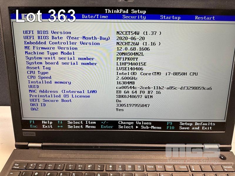 LAPTOP, LENOVO THINKPAD P52 MOBILE WORKSTATION, TYPE 20MA, CORE i7 8850H (8TH GEN) @ 2.6GHz, 16GB DDR4 RAM, 512GB NVMe M.2 SSD, 15.6" WIDESCREEN (1920x1080), 4GB NVIDIA QUADRO P2000 VIDEO, Wi-Fi, BLUETOOTH, WINDOWS 11 PRO INSTALLED (NO POWER SUPPLY) (NOTE: MARKS ON SCREEN) S/N:PF1PK0YY