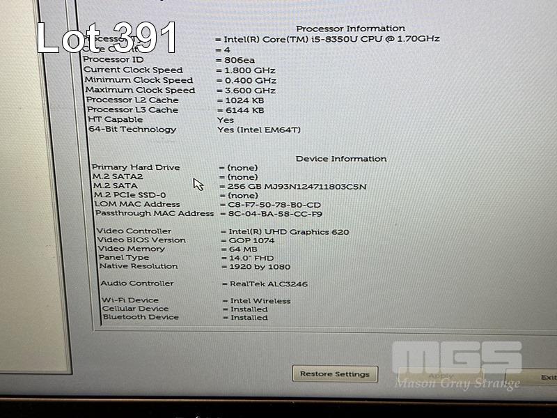 LAPTOP, DELL LATITUDE 5490, CORE i5 8350U (8TH GEN) @ 1.7GHz, 8GB DDR4 RAM, 256GB M.2 SSD, 14" WIDESCREEN (1920x1080), INTEL UHD GRAPHICS 620, Wi-Fi, CELLULAR, BLUETOOTH, WINDOWS 11 PRO INSTALLED (NO POWER SUPPLY) (NOTE: MARKS ON SCREEN) S/N:2VK0QV2