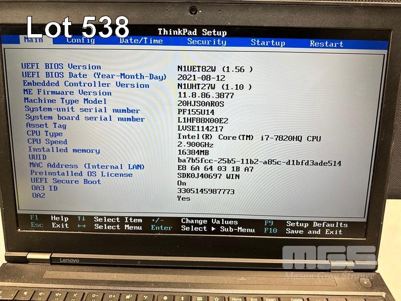 LAPTOP, LENOVO THINKPAD P51 MOBILE WORKSTATION, TYPE 20HJ, CORE i7 7820HQ (7TH GEN) @ 2.9GHz, 16GB DDR4 RAM, 512GB NVMe M.2 SSD, 15.6" WIDESCREEN (1920x1080), 4GB NVIDIA QUADRO M2200 VIDEO, Wi-Fi, BLUETOOTH, WINDOWS 11 PRO INSTALLED (NO POWER SUPPLY) (NOTE: MARKS ON SCREEN) S/N:PF155U14