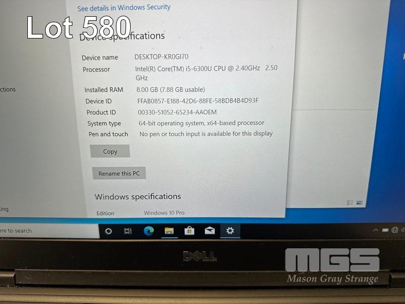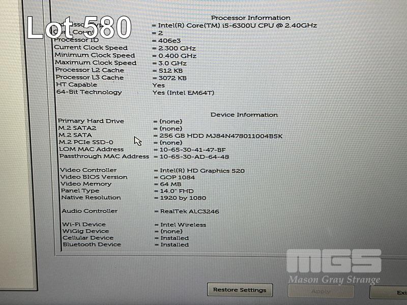 LAPTOP, DELL LATITUDE 5480, CORE i5 6300U (6TH GEN) @ 2.4GHz, 8GB DDR4 RAM, 256GB M.2 SSD, 14" WIDESCREEN (1920x1080), INTEL HD GRAPHICS 520, Wi-Fi, CELLULAR, BLUETOOTH, WINDOWS 10 PRO INSTALLED (NO POWER SUPPLY) (NOTE: MARKS ON SCREEN) S/N:59R5RN2