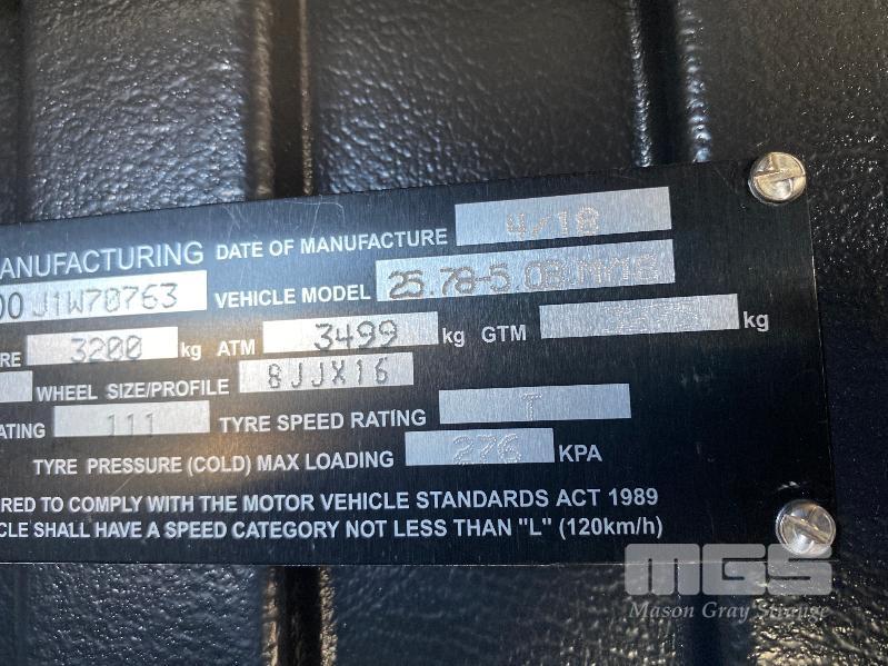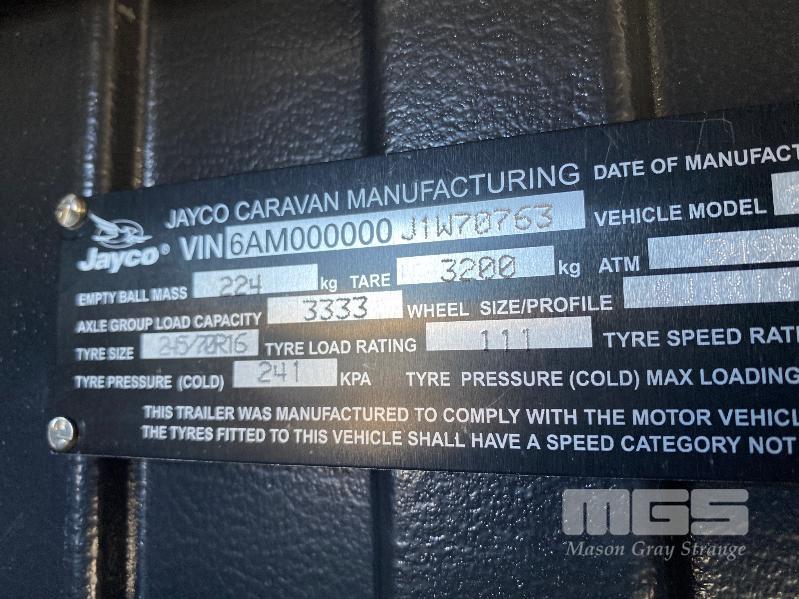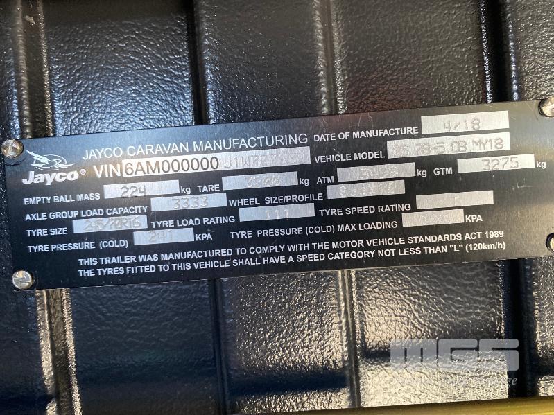 2018 JAYCO SILVERLINE CARAVAN 25' TANDEM AXLE, MOD: 25.78-5.OB.MY18 REG: S461 TGI VIN: 6AM000000J1W70763 EXPANDING, POWER SLIDE OUT CLUB LOUNGE & BEDROOM FULL KITCHEN INCLUDING: DOMETIC GAS OVEN & COOKTOP, MICROWAVE, 216 LITRE DOMETIC 3 WAY FRIDGE/FREEZER, FULL ENSUITE WITH SHOWER & TOILET, WASH BASIN, DOMETIC FRONT LOAD WASHING MACHINE, GAS & ELECTRIC HOT WATER SYSTEM, 2 x 9kg GAS BOTTLES DOMETIC AIR-CONDITIONING SYSTEM, ROOF MOUNT, SLIDE OUT QUEEN BED WITH UNDERBED STORAGE, FURRION ENTERTAINMENT SYSTEM, SWIVEL MOUNT & POP UP LCD TV FROM LOUNGE BENCH TOP, LED LIGHTING, WINEGARD TV ANTENNA & SPHERE SATELLITE SYSTEM, 2 x SKYLIGHTS, 2 x SOLAR PANELS, 2 x BATTERIES, BMPRO BATTERY MANAGEMENT SYSTEM J35, JTECH INDEPENDENT SUSPENSION, AL-KO ESC ELECTRONIC STABILITY CONTROL TEKONSHA BREAKAWAY SWITCH MOD: 2010 50mm BALL HITCH ALLOY RIMS & 245/17 OR16 TYRES & SPARE OUTDOOR SHOWER, REAR MOUNT BIKE RACK, 2 x WATER TANKS & 1 x GREY WATER TANK, MULTIPLE OUTSIDE STORAGE COMPARTMENTS, GENERATOR SLIDE OUT TRAY, ROLL OUT AWNING, TARE: 3,200kg ATM: 3,499kg GTM: 3,275kg BOOKS IN THE OFFICE KEY #57