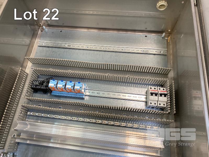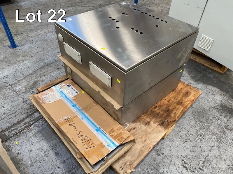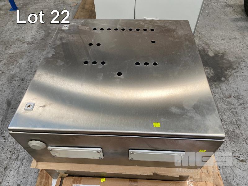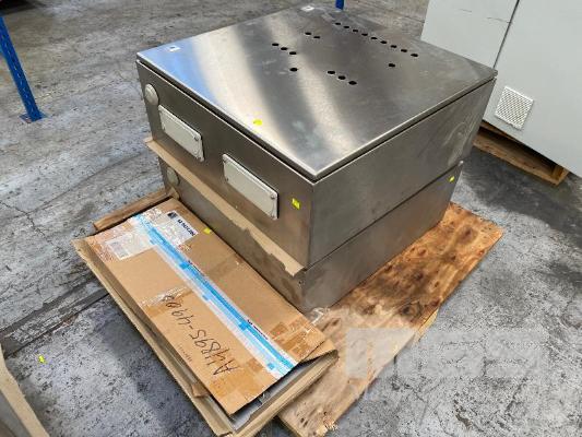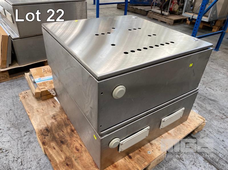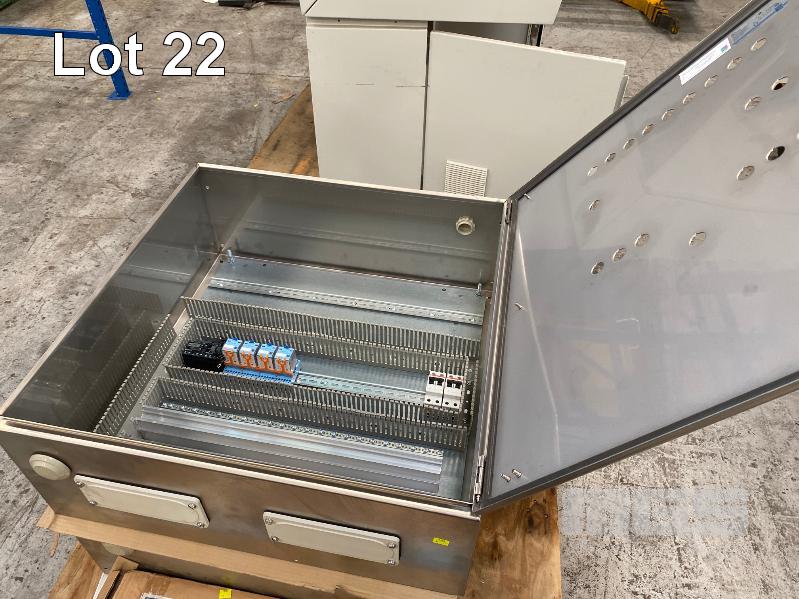 2 x ELECTRICAL CONTROL CABINETS, RITTAL STAINLESS STEEL, SINGLE DOOR SIZE: 760 x 760 x 310mm WITH BUTTON HOLES, CONTACTORS & RAILS