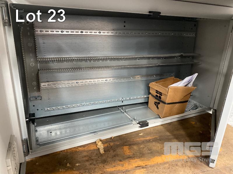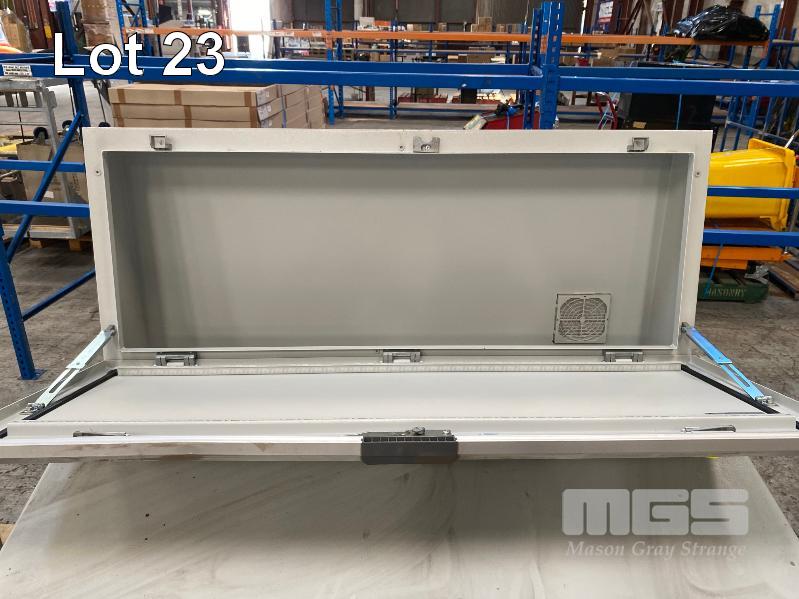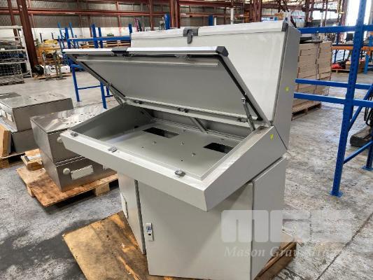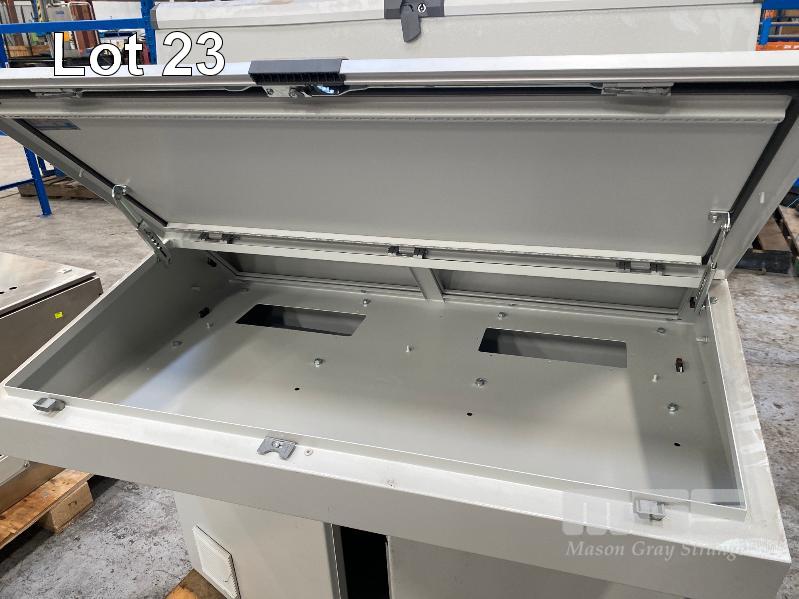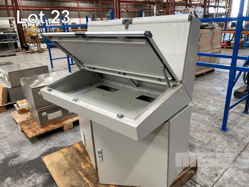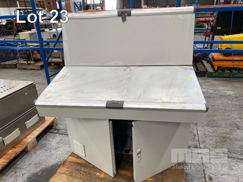 OPERATOR CONTROL PANEL BOARD, RITTAL WITH 2 x PROTECTIVE HINGED COVERS PAINTED STEEL 1200 x 800 x 1330mm (H) & 2 DOOR UNDER PANEL ELECTRICAL CONTROL CABINET WITH MOUNTING RAILS 1200 x 400 x 650mm (H)