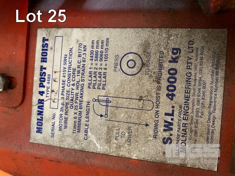 MOLNAR 4 POST AUTOMOTIVE HOIST TYPE: 4488 LIFT CAP: 4,000kg S/NO: 6261 LENGTH: 4500mm WIDTH: 500mm, 415V