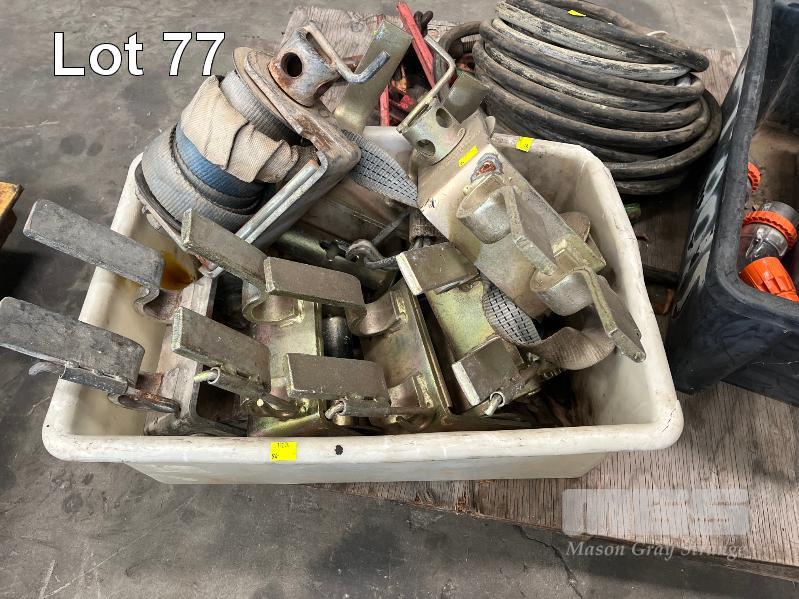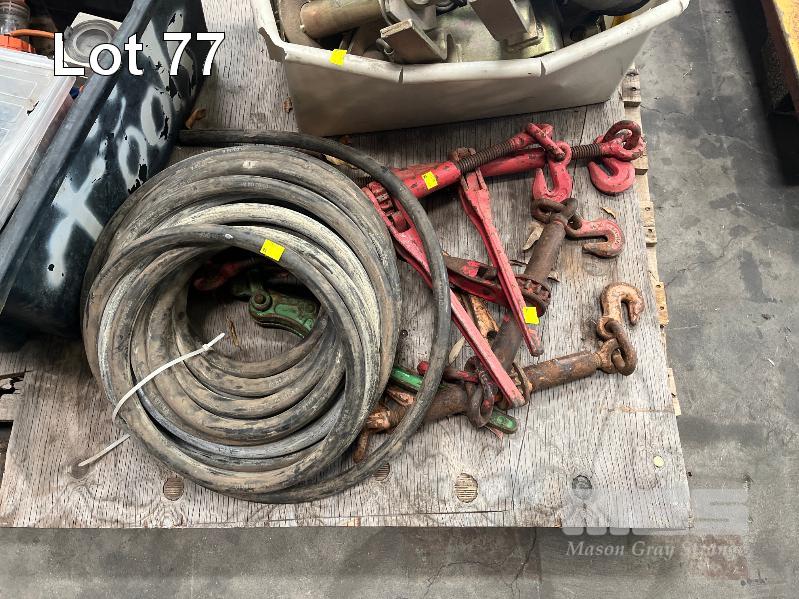 7 x LOAD BINDERS, (6 WITH STRAPS, 1 WITHOUT STRAP) 4 x RATCHET CHAIN DOGS & 1 x LEVER, HOSE, ELEC FITTINGS & TIMBER TEK SCREWS 1 x PALLET