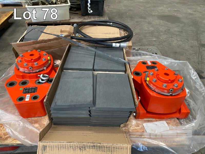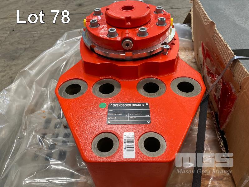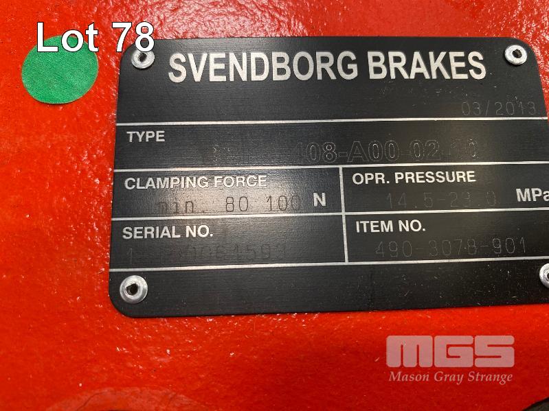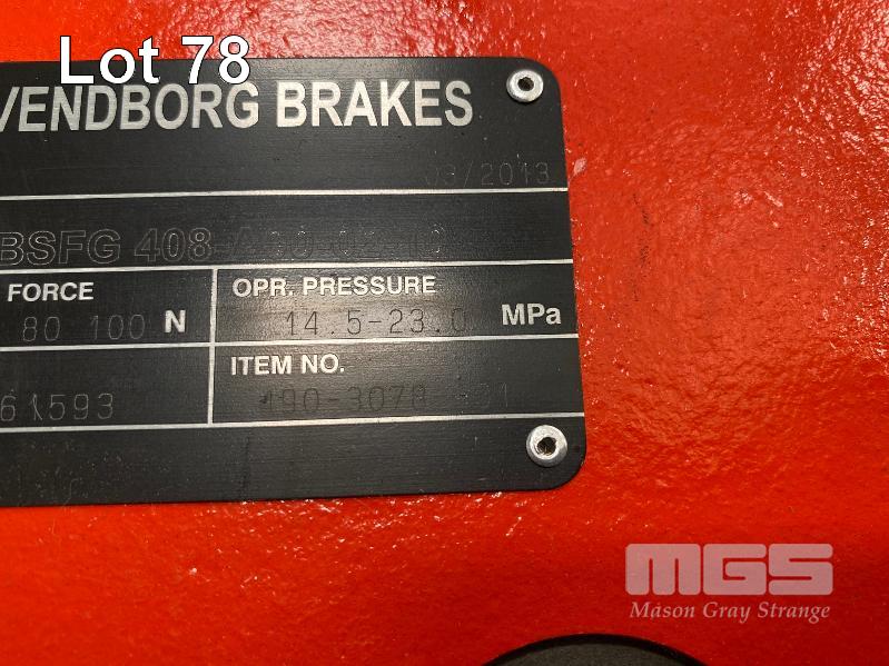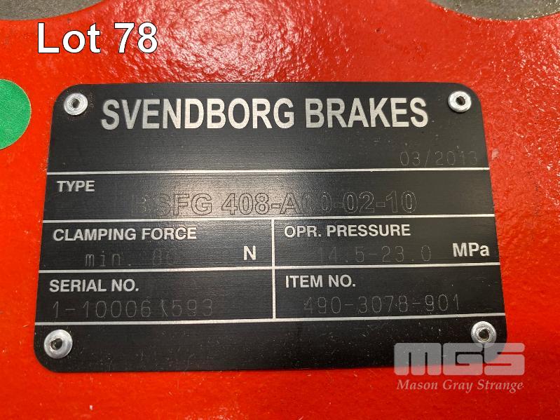 2 x SVENDBORG BRAKING SYSTEM FOR HEAVY DUTY INDUSTRIAL APPLICATION, TYPE: BSFG408-A00-02-10 CLAMPING FORCE: 80-100N DOM: 2013 WITH 3 x BOXES BRAKE PADS SIZE: 300 x 220 x 25mm 1 x PALLET