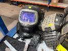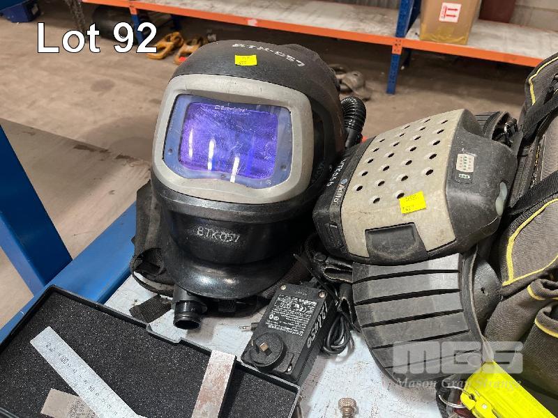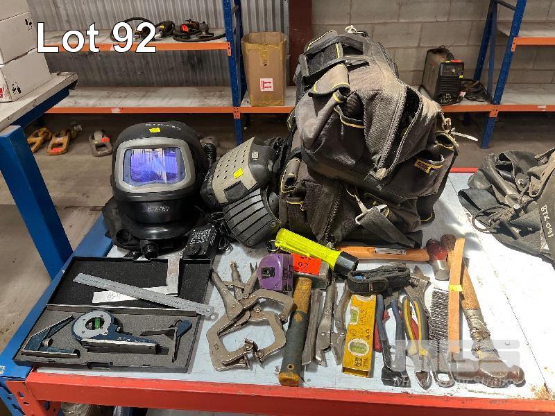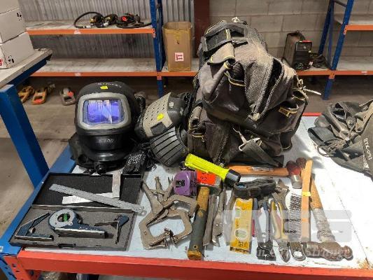 POSITIVE AIR FEED WELDING MASK, 3M SPEED GLASS AUTO TINT WITH FAN PACK BATTERY, CHARGER, HOSE & CARRY BAG 2 x STANLEY TOL BAGS WITH ASSORTED TOOLS INCLUDING VICE GRIPS, HAMMERS, SPIRIT LEVEL, PRECISION MEASURING/INSPECTION TOOLS, ETC NO BATTERIES