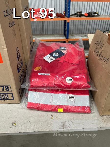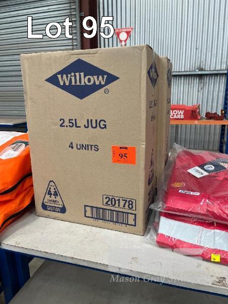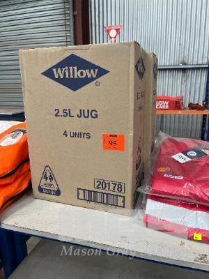 4 x WORK OVERALLS, F TECH SIZE: 92R RED, HI VIS, NEW WITH 1 x BOX TAPER FIT 3M EARPLUGS, BOLLWERK WORK GLOVES, ETC & 8 x WILLOW COOLER JUGS, 2.5 LITRE 1 x SHELF