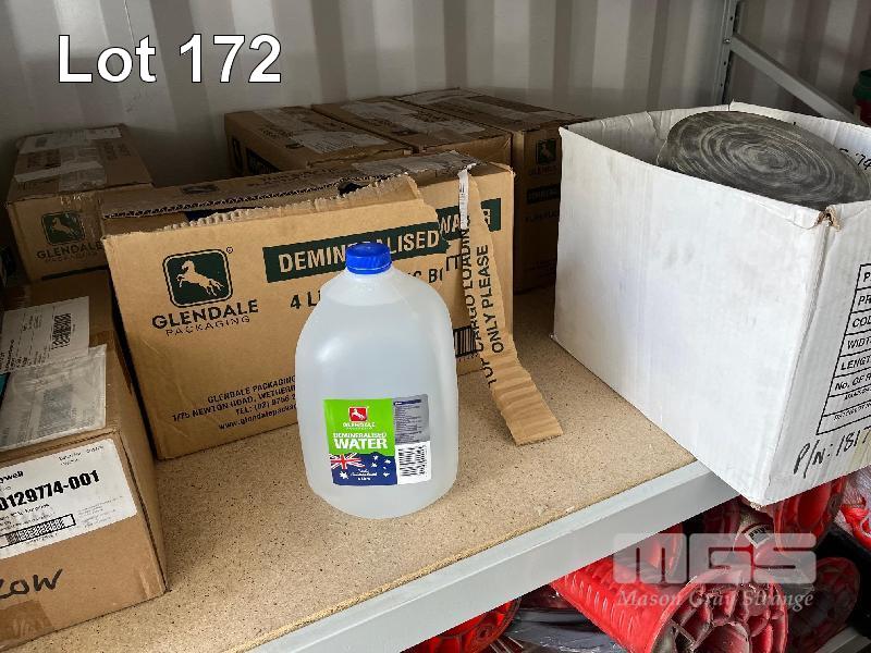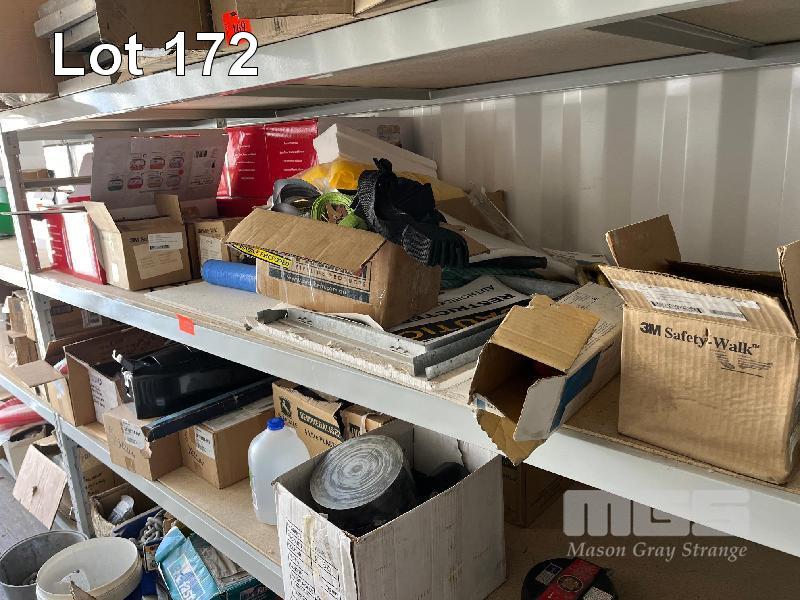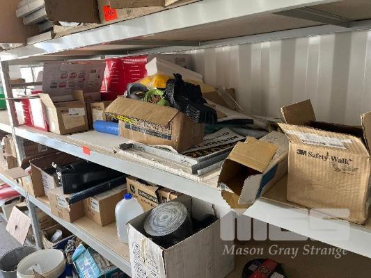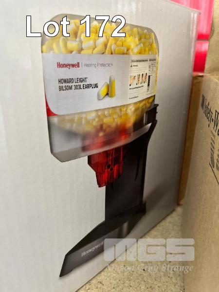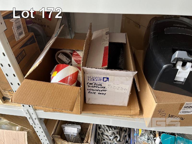 CONTENTS OF SHELF 10 x HONEYWELL HL400 EARPLUG DISPENSERS (400 PAIRS WITH EACH) 3 x ROLLS 3m SAFETY WALK TAPE, RATCHET STRAPS, STAR DROPPER COVERS, AIR HOSE, 5 x BOXES DEMINERALISED WATER, REFLECTIVE TAPE