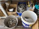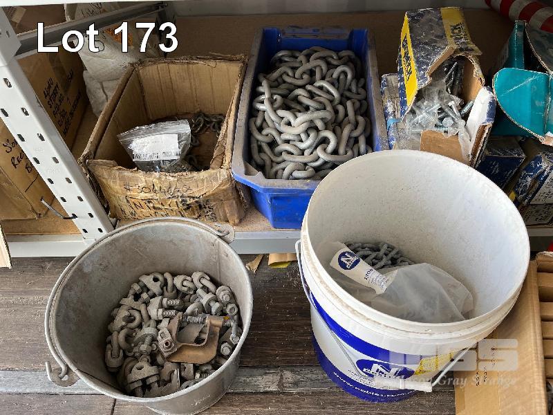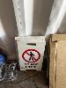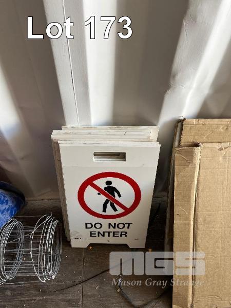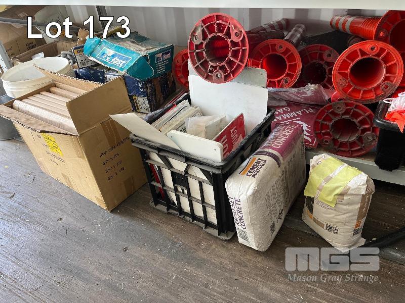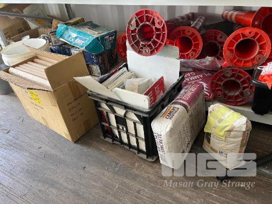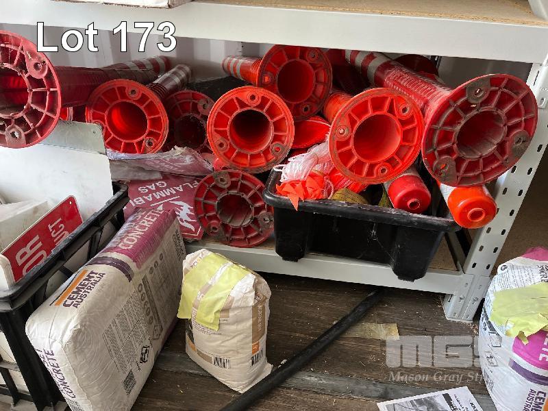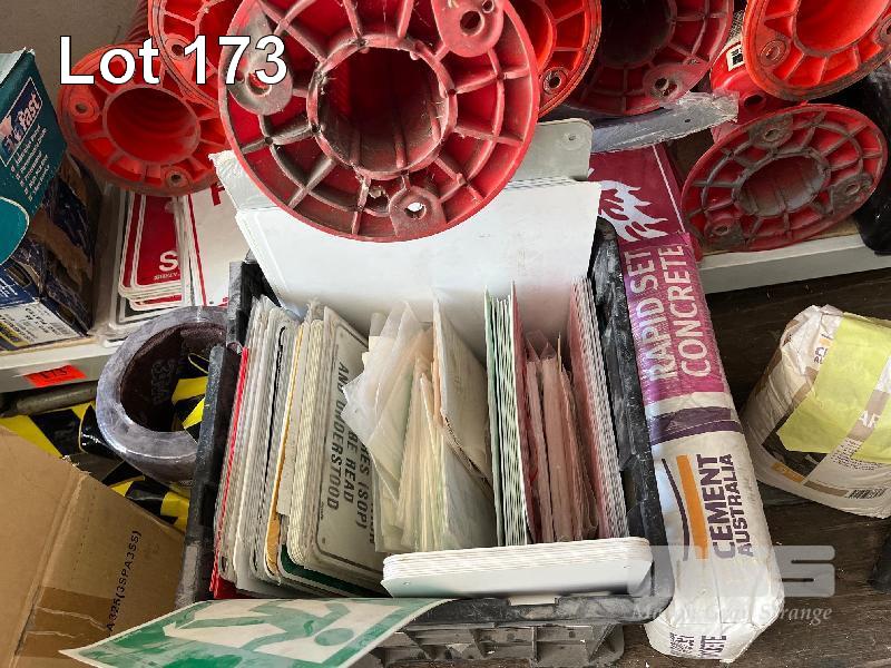 CONTENTS OF SHELF LARGE QUANTITY OF WORKSHOP SAFETY SIGNS, CHAINS, 8 CARTONS OF M10 x 65mm ZINC PLATED BOLTS, CONVEX SAFETY MIRROR, SAFETY BOLLARDS & BUNTING