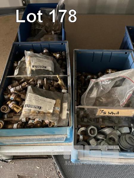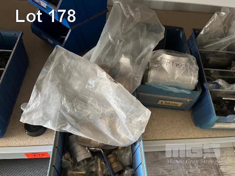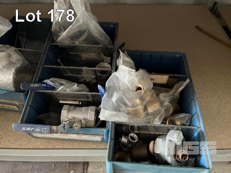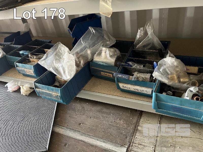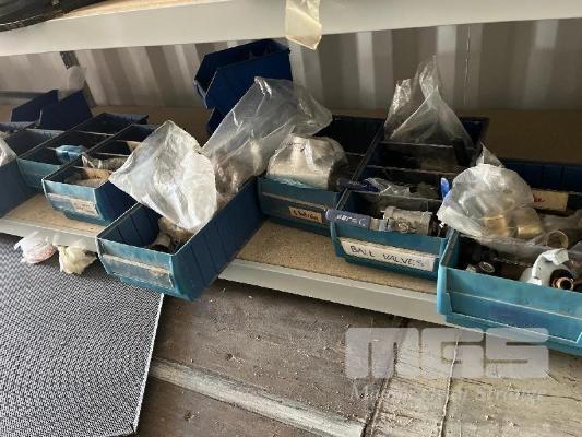 CONTENTS OF SHELF 3 x TUBS OF OXY COUPLINGS (FUEL & OXYGEN) VARIOUS BRASS HOSE/PIPE FITTINGS 1/4 TURN SHUT OFF VALVES