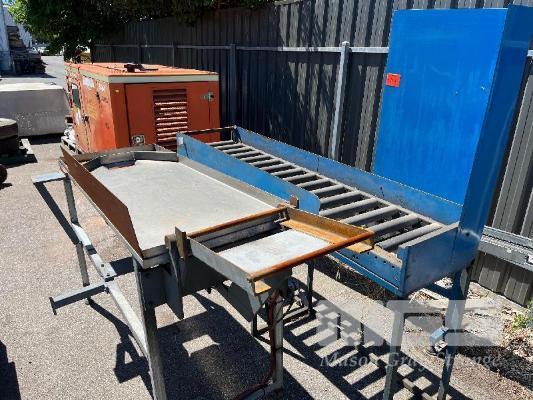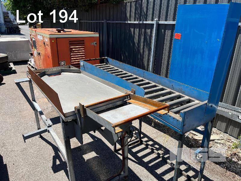 STAINLESS STEEL WORK PLATFORM WITH CHUTE, PNEUMATIC ARM, 1600 x 600 x 1000mm (H), ROLLER SECTION, 1950 x 500 x 950mm (H)
