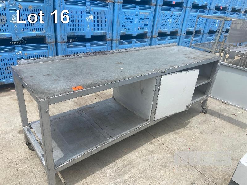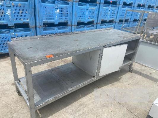 STEEL WORK BENCH, 2400 x 600mm, 3mm PLATE TOP, MOBILE, 2 DOOR CUPBOARD & SHELVES
