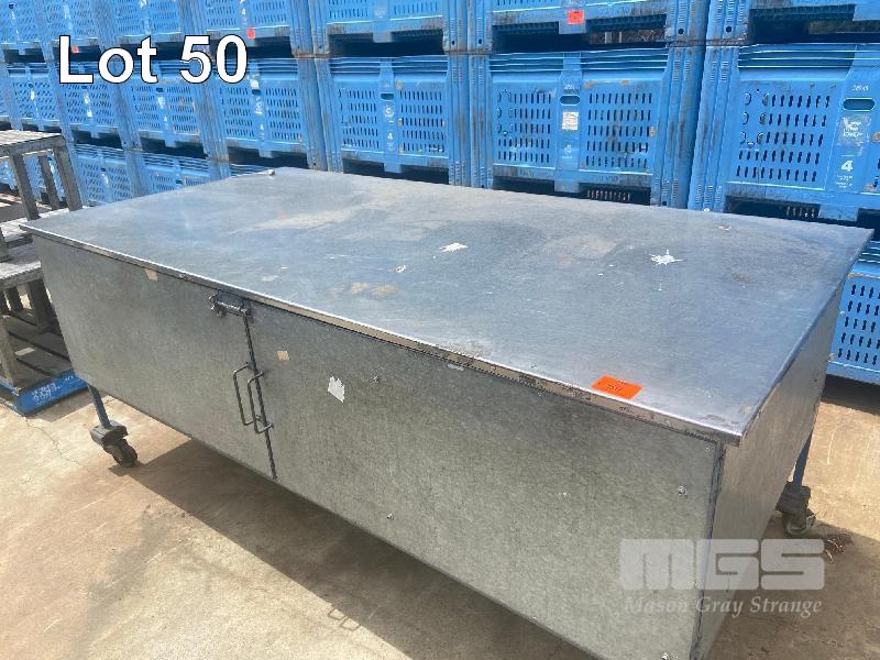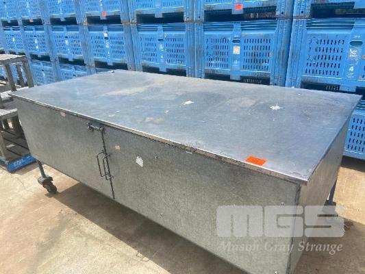 LARGE MOBILE WORKBENCH, 2 DOOR STORAGE, STAINLESS STEEL TOP, STEEL FRAME