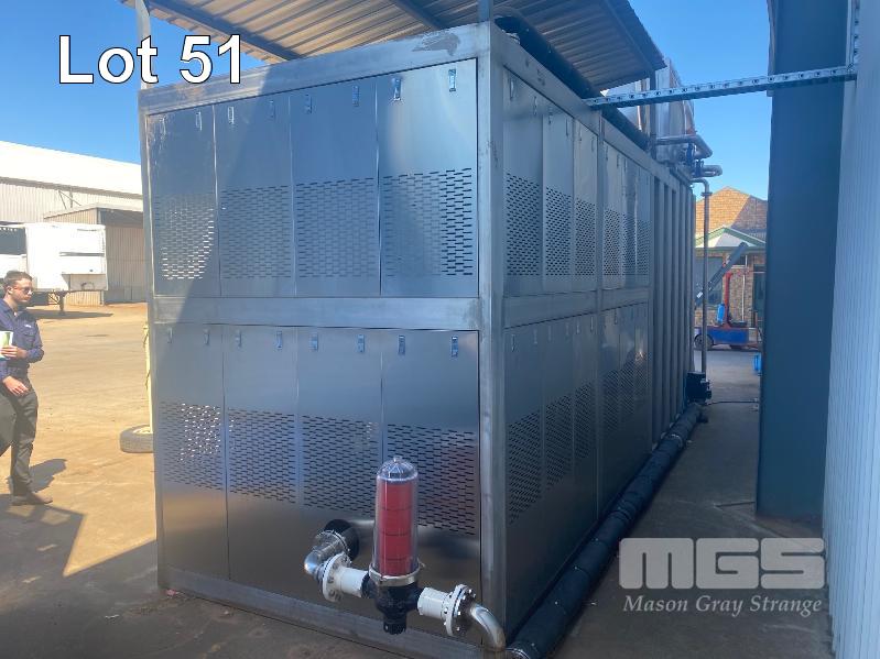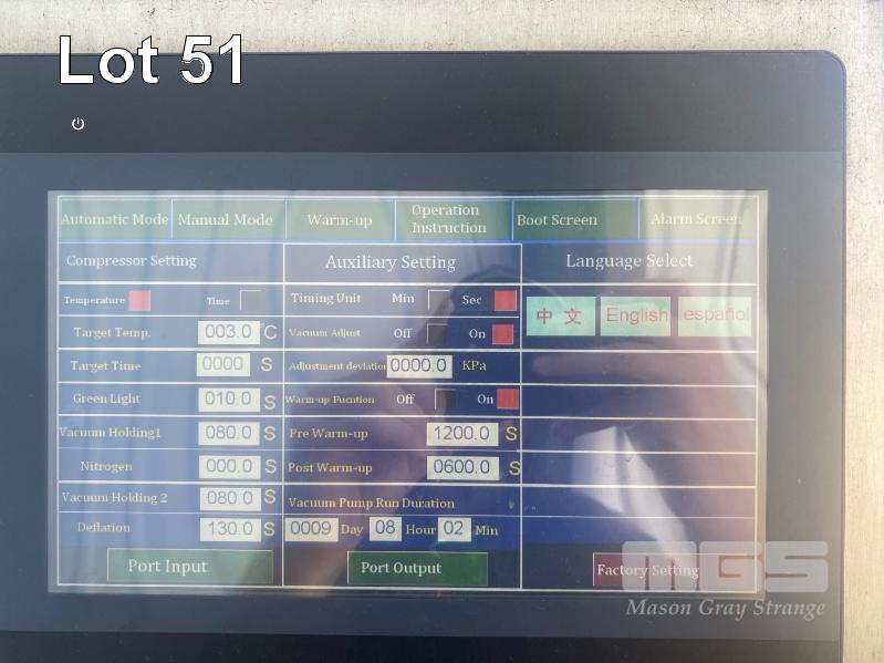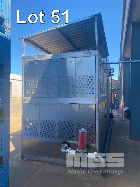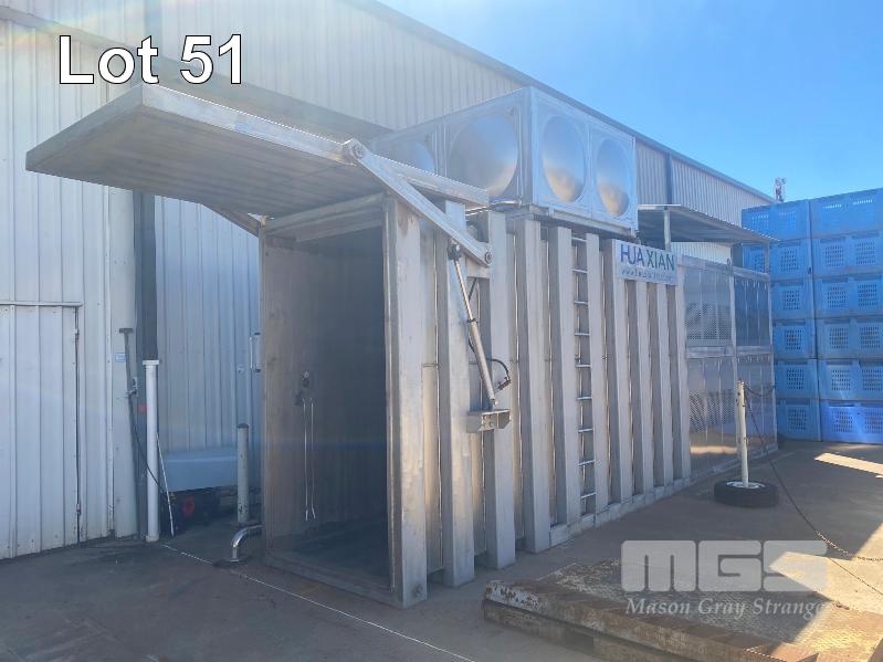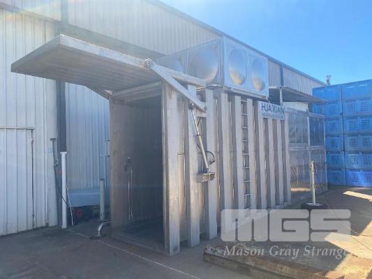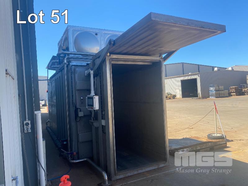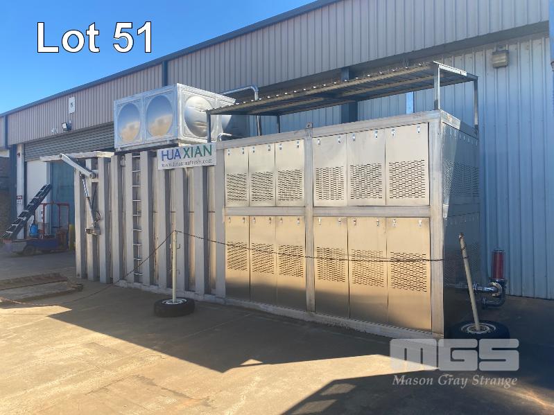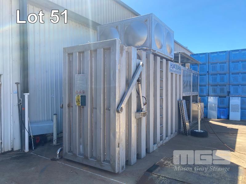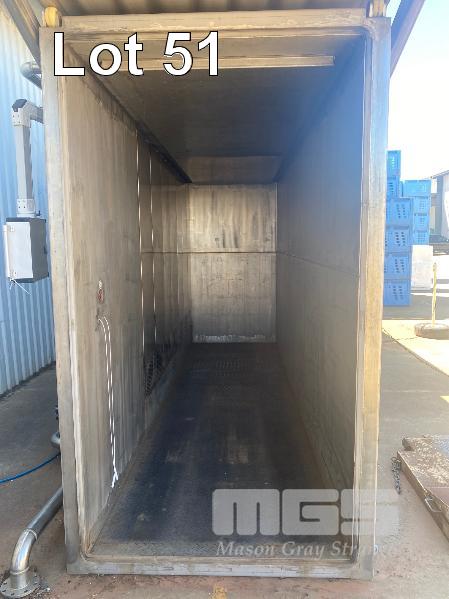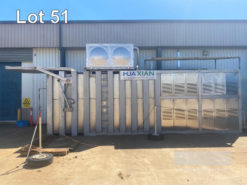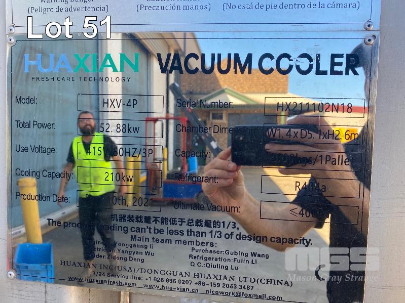 2021 HUAXIAN VACUUM COOLER MOD: HXV-4P S/NO: HX211102N18 COOLING CAPACITY: 210kw DOM: 10/2021 VACUUM PUMP RUN DURATION: 9 DAYS, 8 HOURS, 2 MINS REFRIGERANT: R404a 3 PHASE 415V CHAMBER DIMENSIONS: 1400 (W) x 5100 (D) x 2600mm (H) (1 x PALLET WIDE x 4 PALLETS DEEP) STAINLESS STEEL CONSTRUCTION HYDRAULIC ACCESS DOOR, TOUCH SCREEN CONTROLS WITH ADDITIONAL HYDRO COOLING UNIT, PROVIDES CHILLED WATER COOLING FROM TOP FOLD OUT LOADING RAMP INCLUDED INTERNAL EMERGENCY STOP ORIGINALLY USED FOR FREEZING LEAFY GREEN VEGETABLES ADDITIONAL INFORMATION AVAILABLE IN 'AUCTION DOCUMENTS' SECTION WITH OPERATIONS MANUAL