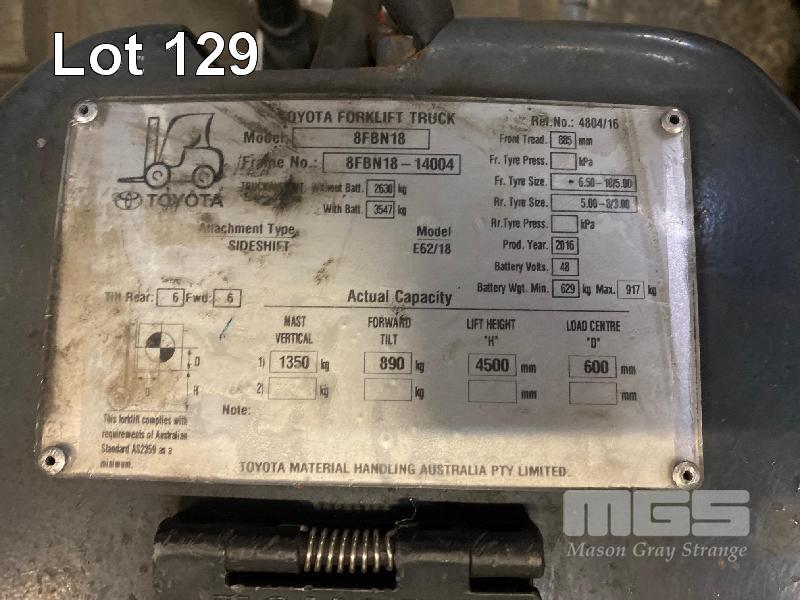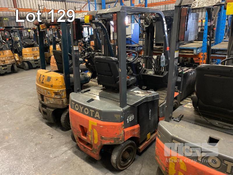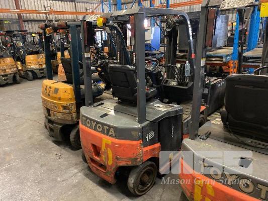 ELECTRIC FORKLIFT, TOYOTA MOD: 8FBN18 S/NO: 8FBN18-14004 CAPACITY: 1,350kg HOURS: 8,473 MAX HEIGHT: 4,500mm TILT, SIDE SHIFT, 3 STAGE CONTAINER MAST SOLID TYRES WITH 3 x SETS BATTERIES