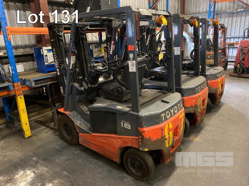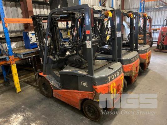 ELECTRIC FORKLIFT, TOYOTA MOD: 8FBN18 S/NO: 8FBN18-13163 CAPACITY: 1,350kg HOURS: 16,344 MAX HEIGHT: 4,500mm TILT, SIDE SHIFT, 3 STAGE CONTAINER MAST SOLID TYRES WITH 3 x SETS BATTERIES