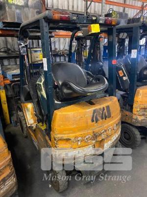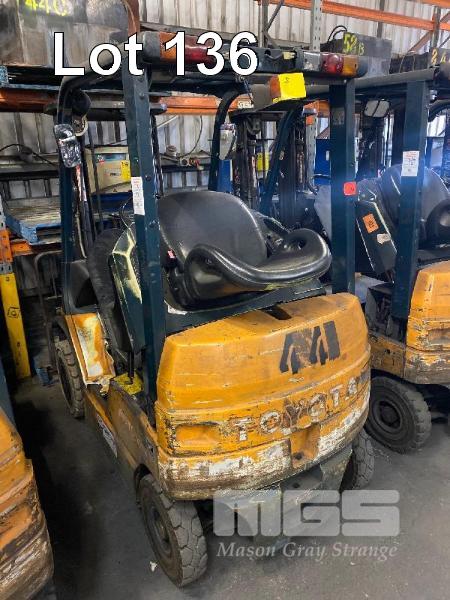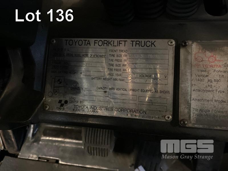 ELECTRIC FORKLIFT, TOYOTA MOD: 7FB18 S/NO: 7FB18-24495 CAPACITY: 1,360 HOURS: 49,219 MAX HEIGHT: 4,700mm TILT, SIDE SHIFT, 3 STAGE CONTAINER MAST SOLID TYRES WITH 3 x SETS BATTERIES