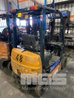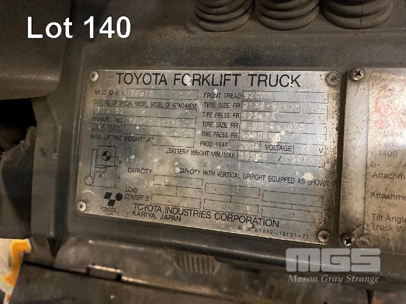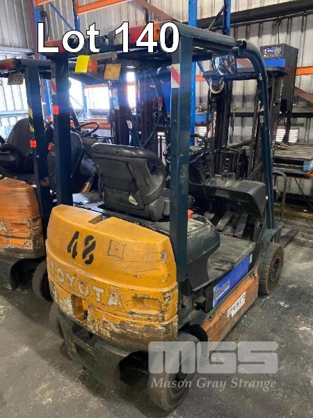ELECTRIC FORKLIFT, TOYOTA MOD: 7FB18 S/NO: 7FB18-24743 CAPACITY: 1,360 HOURS: 55,605 MAX HEIGHT: 4,700mm TILT, SIDE SHIFT, 3 STAGE CONTAINER MAST SOLID TYRES WITH 1 x SET BATTERIES