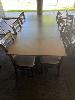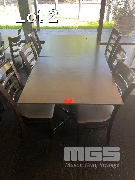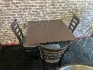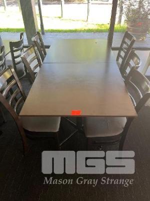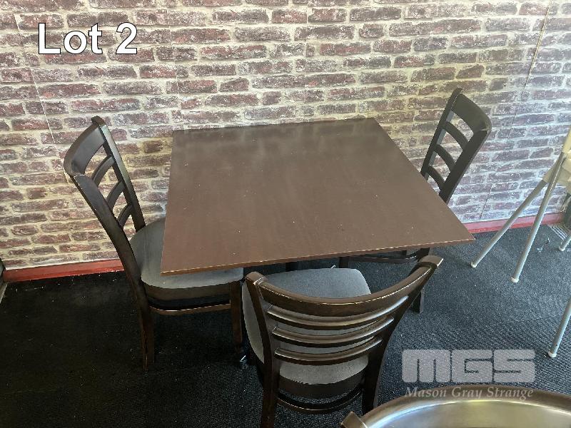 5 x PEDESTAL CAFE TABLES, BROWN TIMBER LAMINATE & 17 x CHAIRS