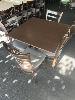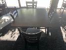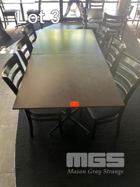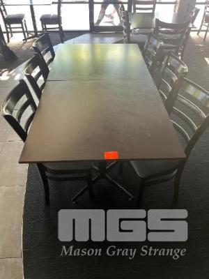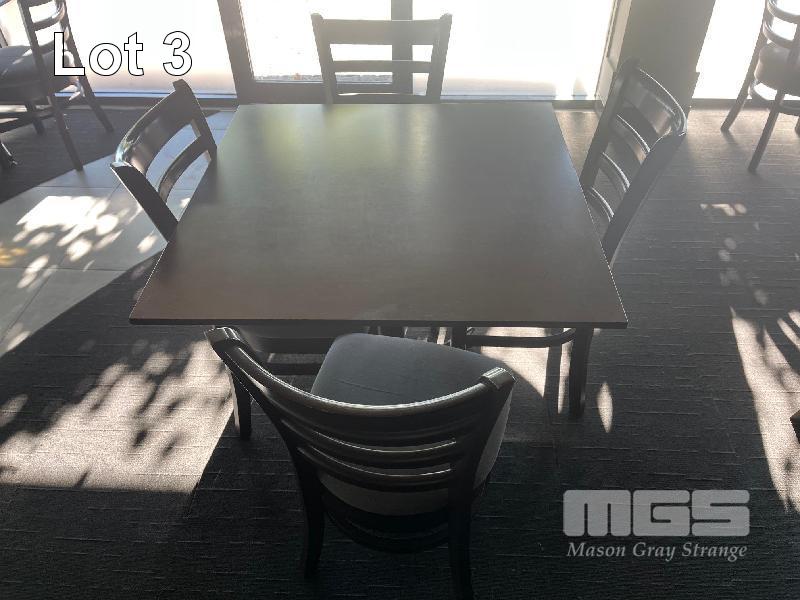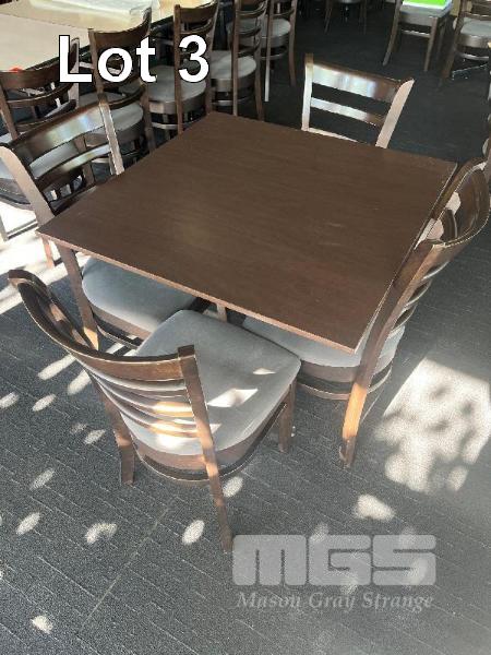 4 x PEDESTAL CAFE TABLES, BROWN TIMBER LAMINATE & 12 x CHAIRS