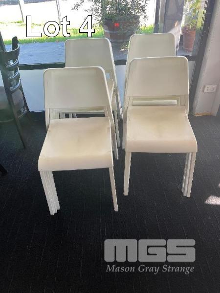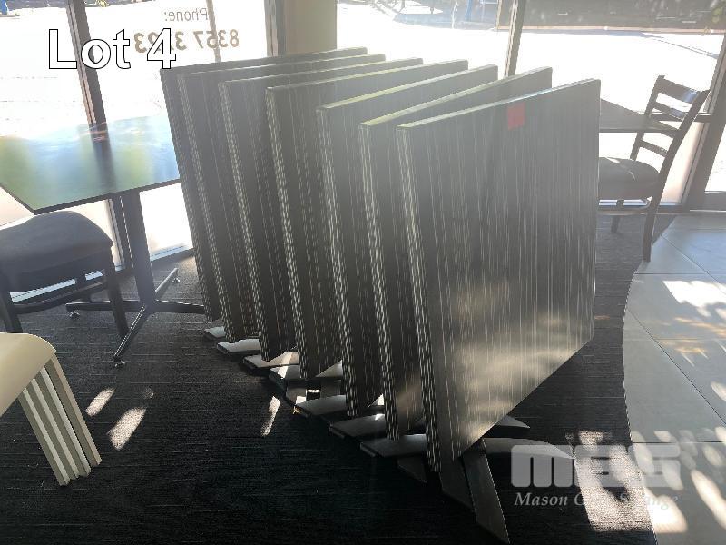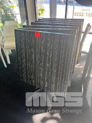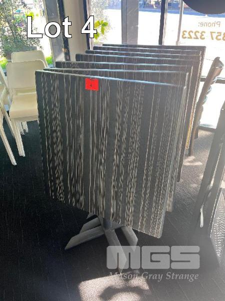 7 x FOLDAWAY CAFE TABLES, BROWN MOULDED TOP, PEDESTAL BASE, 800 x 800mm, GERMAN MADE & 16 x OUTDOOR CAFE CHAIRS, WHITE