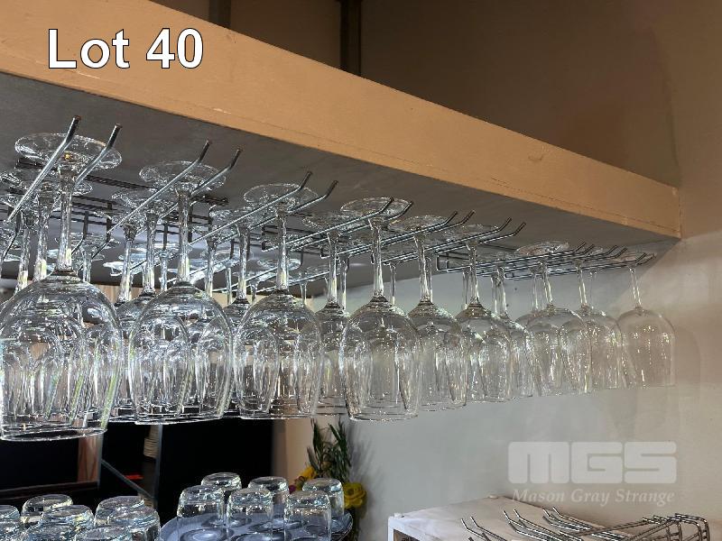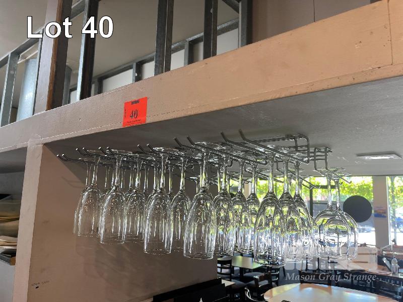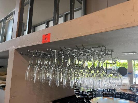 55 x WINE GLASSES & 22 x CHAMPAGNE GLASSES, WITH HANGING RACK