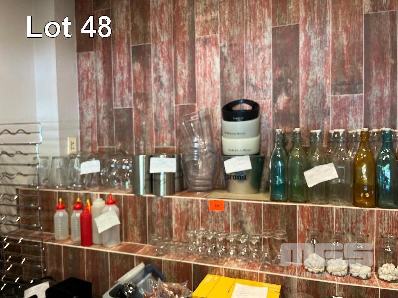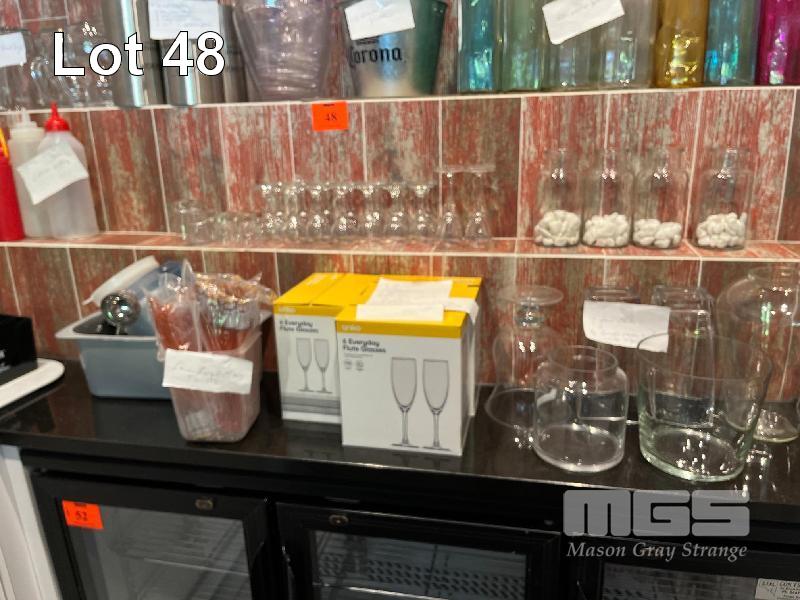 10 x GLASS SOFT DRINK JUGS, 6 x STAINLESS STEEL WINE COOLERS, 10 x PLASTIC WINE COOLERS, 1 x CORONA BEER BUCKET, 29 x GLASS WATER JUGS, 2 x DRINK DISPENSERS ON STANDS, 6 x SAUCE BOTTLES, MARTINI GLASSES 14 x PORT GLASSES, 18 x CHAMPAGNE FLUTES