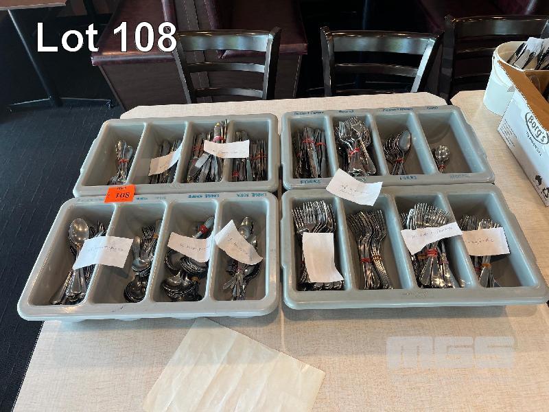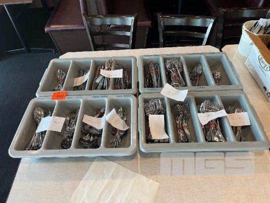 4 x CUTLERY TRAYS, 88 x DESSERT SPOONS, 34 x SOUP SPOONS, 49 x TEASPOONS, 70 x ENTRE FORKS, 30 x CAKE FORKS, 30 x ENTREE KNIVES, 152 x MAIN COURSE KNIVES APPROX