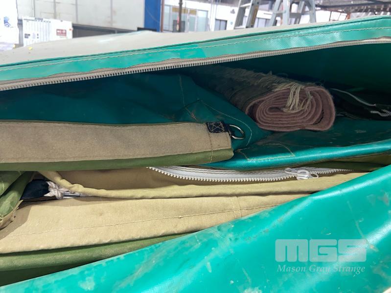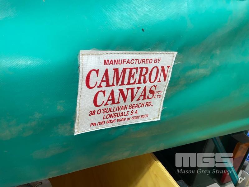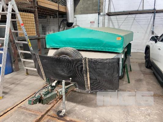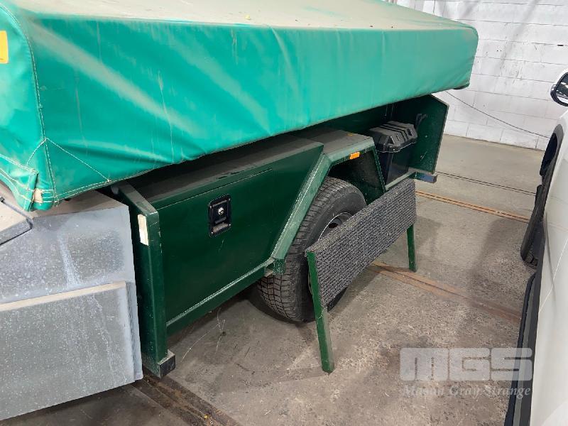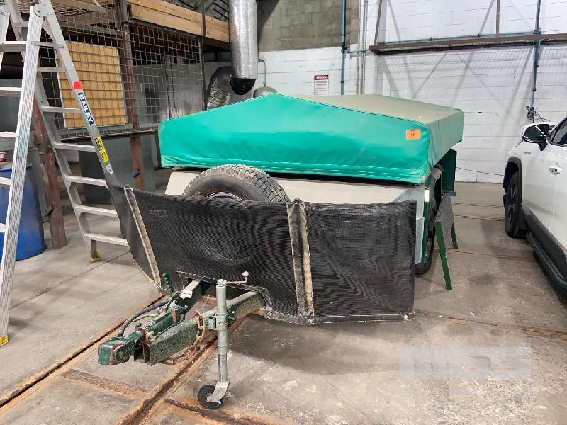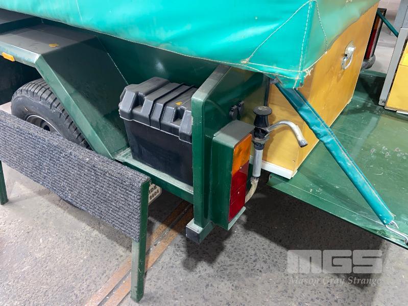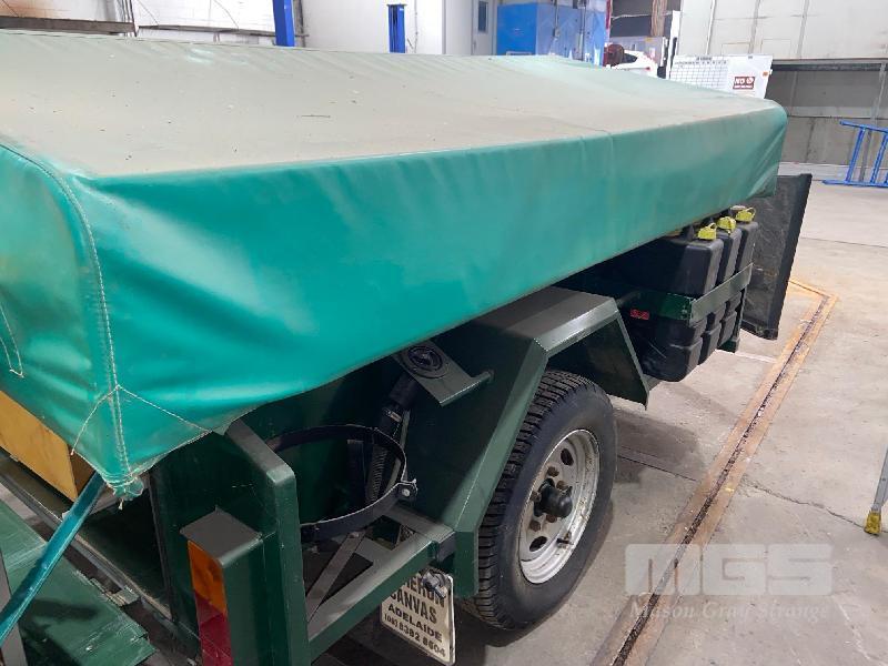 CANVAS CAMPER TRAILER, CAMERON REG. YCX 089. VIN 6G9T2000X2PL8084 DOM 1999. SUIT 4WD OFF ROAD SINGLE AXLE WATER TANK, GAS BOTTLE HOLDER 3 x 20 LITRE POLY FUEL CANS & RACK FRONT MOUNT STORAGE BOX JOCKEY WHEEL, SPARE TYRE SLIDE OUT STORAGE COMPARTMENT WORK STANDS, BATTERY IN BOX GRAVEL RASH PROTECTOR. RUBBER BLOCK, COUPLER & TOW FITTING 12V PLUG, "ANDERSON" LARGE TENT/ANNEX SLIDE OUT TO REAR PLYWOOD COOKING BENCH WITH DRAWER & STORAGE BOX. HEAVY DUTY SQUARE AXLE & LAND ROVER WHEELS GOOD TYRES