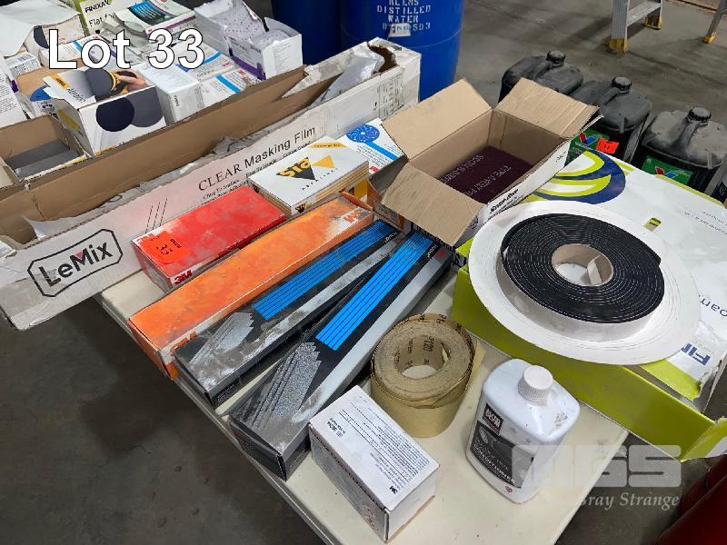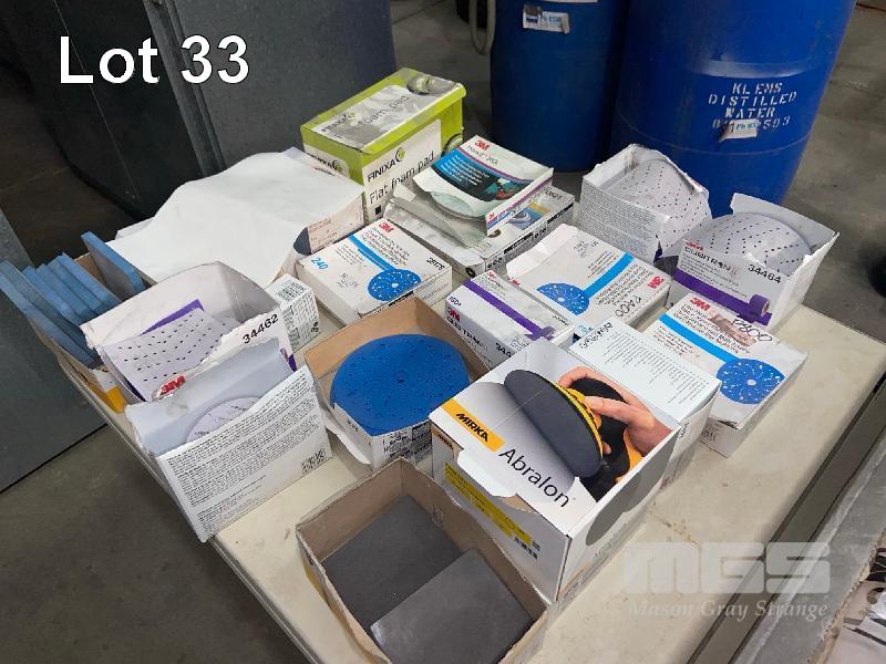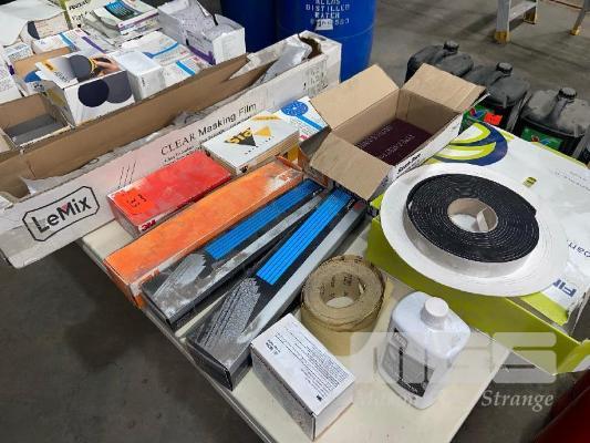 LARGE QUANTITY SANDING SHEETS, DISCS, PADS, SCOTCH BRITE TAPE, ETC ON TABLE