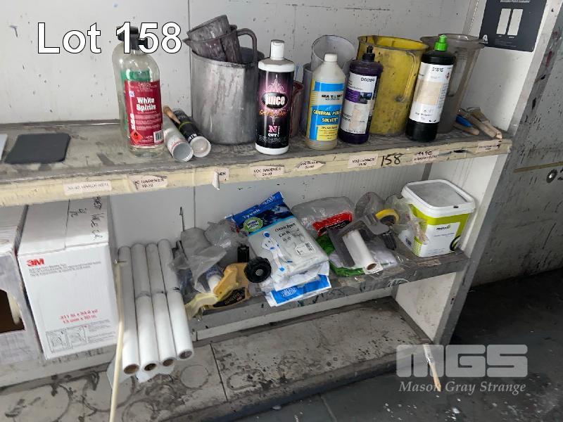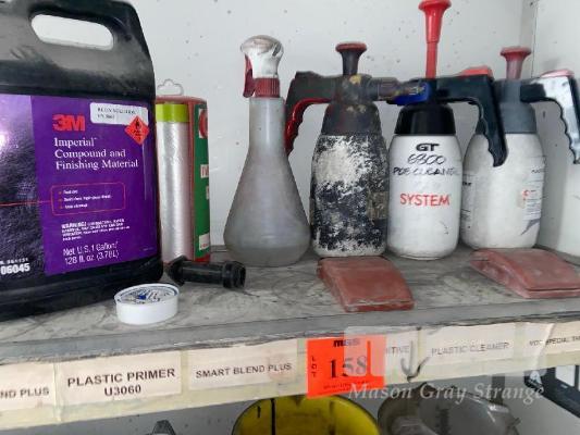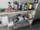 PUMP SPRAYS, JUGS, POLISH, COVERALLS, TAPE DISPENSERS, ETC 4 x SHELVES