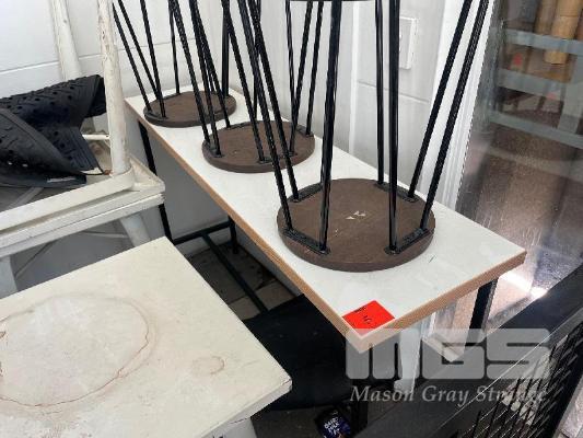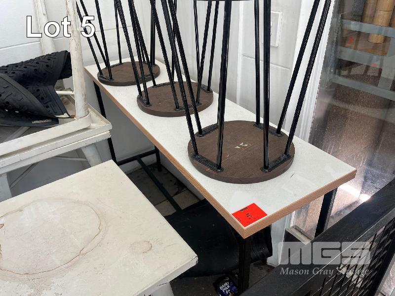 STEEL FRAME CAFE BENCH, TIMBER LAMINATE TOP, 1500 x 400 x 900mm (H) WITH 3 x TIMBER TOP BAR STOOLS