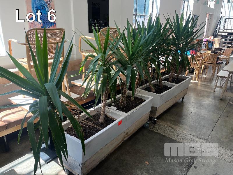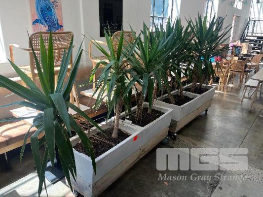 PAIR PLASTIC PLANTER POTS, MOBILE,. 1500 x 500mm WITH 8 x YUCCA PLANTS
