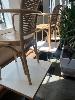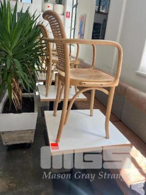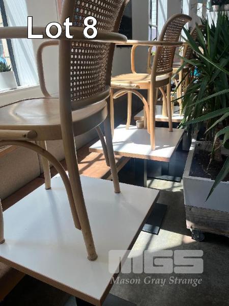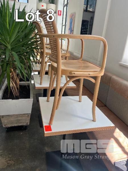 6 x TIMBER LAMINATE CAFE TABLES, BLACK STEEL PEDESTAL, 600 x 600mm WITH 7 x THONET BENTWOOD CHAIRS, WICKER BACK