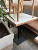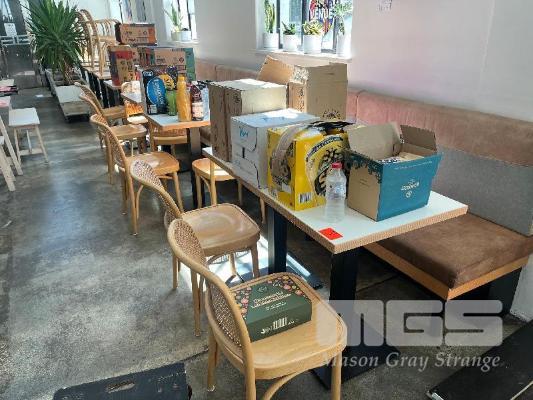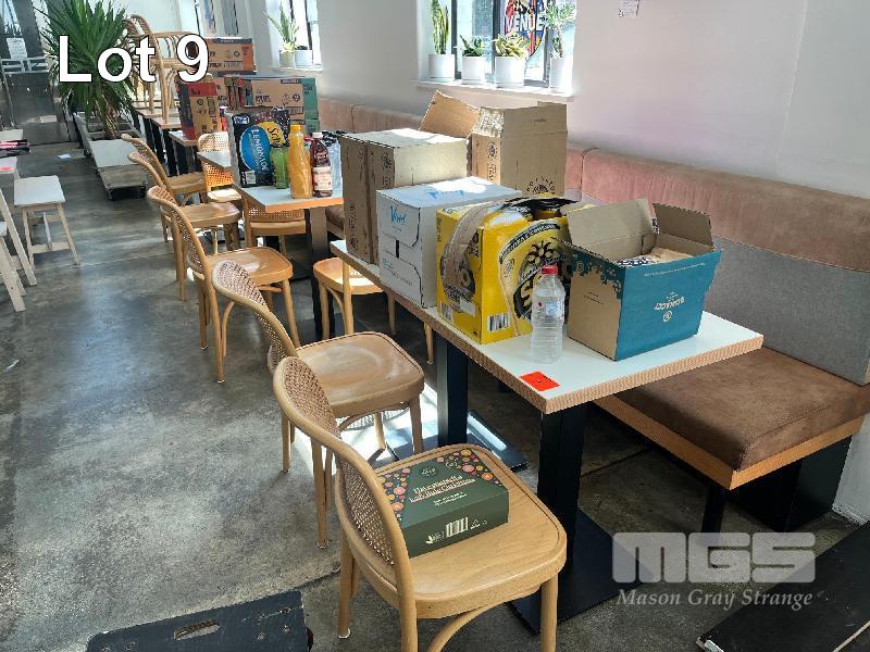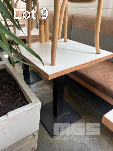 5 x TIMBER LAMINATE CAFE TABLES, BLACK STEEL PEDESTAL, 600 x 600mm WITH 7 x THONET BENTWOOD CHAIRS, WICKER BACK