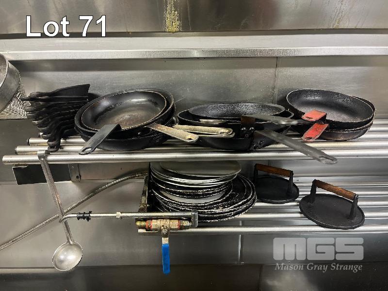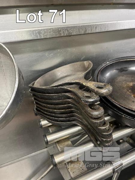 2 x LARGE COLANDERS, 9 x SMALL CAST IRON SKILLETS, 10 x FRY PANS, 17 x PIZZA TRAYS & 2 x CAST IRON BURGER PRESSES