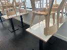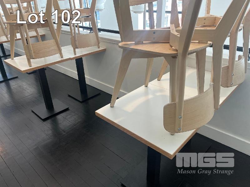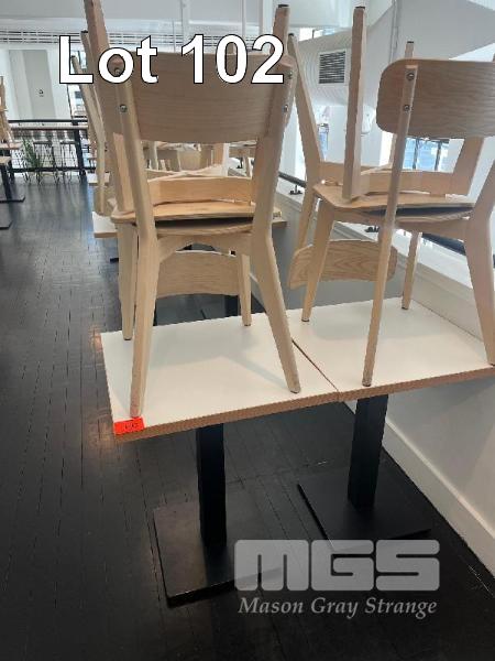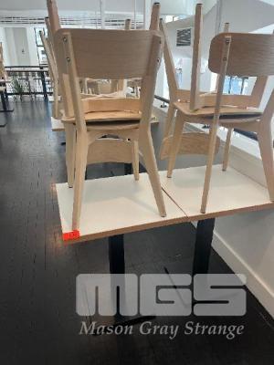 7 x CAFE TABLES, TIMBER LAMINATE, BLACK STEEL PEDESTAL, 600 x 600mm WITH 14 x TIMBER CHAIRS
