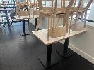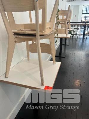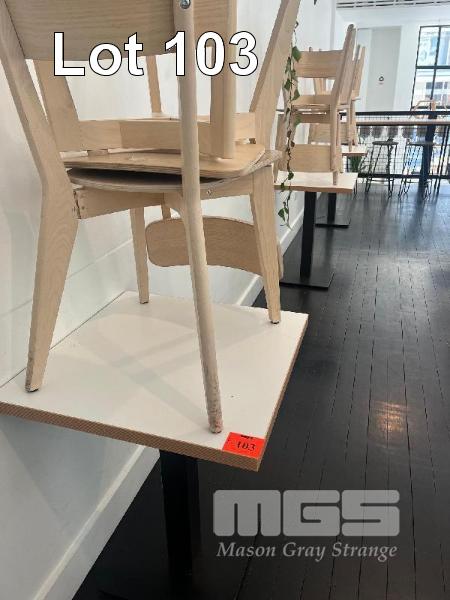 7 x CAFE TABLES, TIMBER LAMINATE, BLACK STEEL PEDESTAL, 600 x 600mm WITH 14 x TIMBER CHAIRS