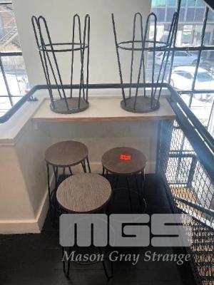 5 x TIMBER TOP BAR STOOLS, BLACK STEEL BASE