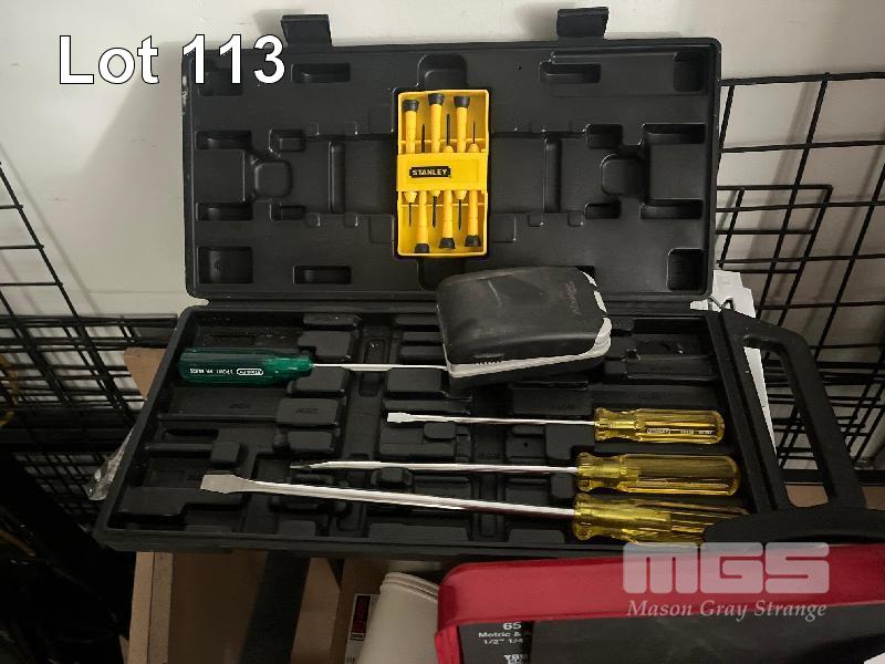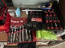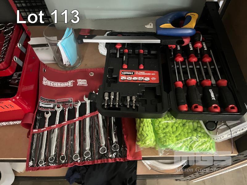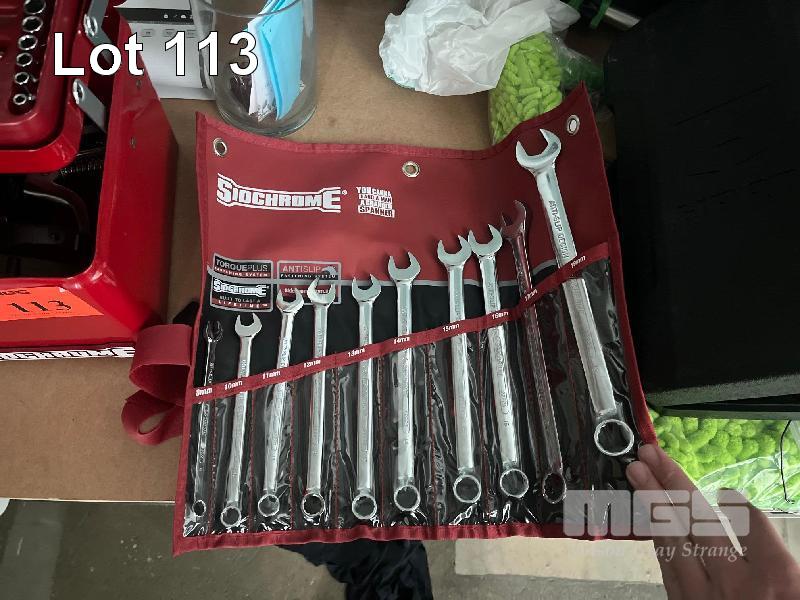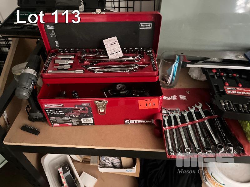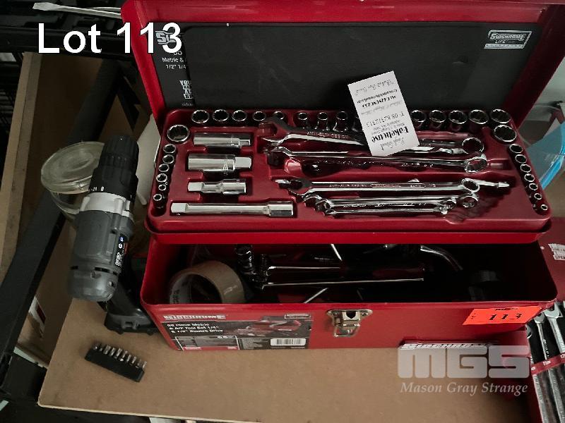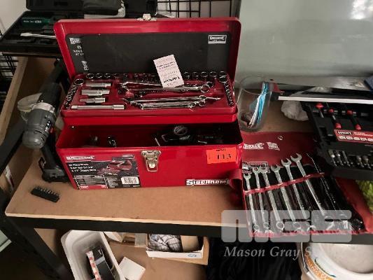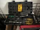 SIDCHROME TOOL BOX WITH ASSORTED HAND TOOLS, SIDCHROME 10 PIECE SPANNER SET, OZITO 18V DRILL, HAND SAW, HACK SAW, ETC