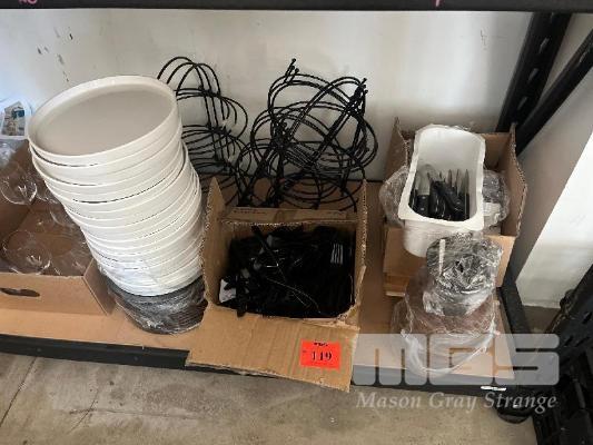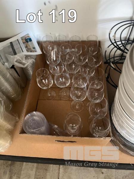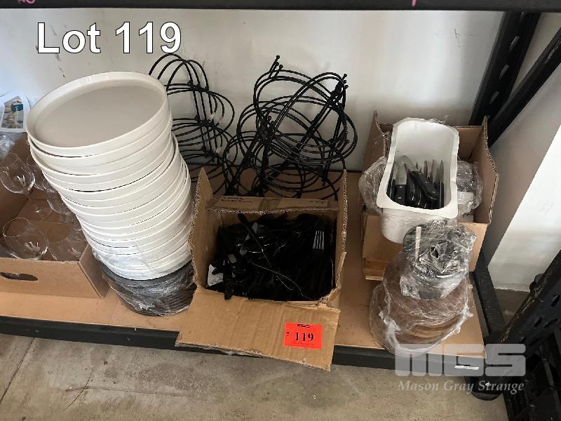 20 x WINE GLASSES, 31 x DINNER PLATES, 250mm,. LARGE QUANTITY BLACK CUTLERY, STEAK KNIVES, PLATE HOLDERS, TIMBER & SLATE SERVING PLATTERS