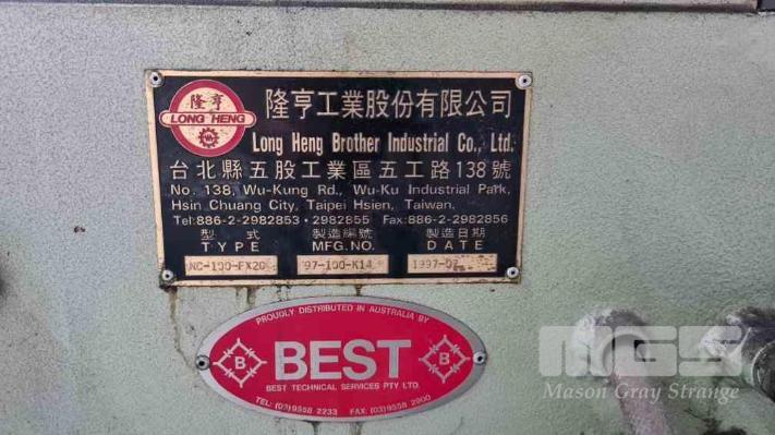 INJECTION MOULDING MACHINE, LONG HENG BROTHER INDUSTRIAL CO MACHINE ID: 32 MOD: NC-100 FX20 S/NO: 97-100-K14 DOM: 1997 HOURS SHOWING: N/A RATED: 100 TONNE 3 PHASE INCL HOPPER DRYER WEIGHT: UNKNOWN EXTRAS: INCLUDING ACCESSORIES & ASSOCIATED TOOLING, ROBOT ARM ATTACHMENT **LOCATED AT 1-3 REMONT COURT, CHELTENHAM VIC 3192 **