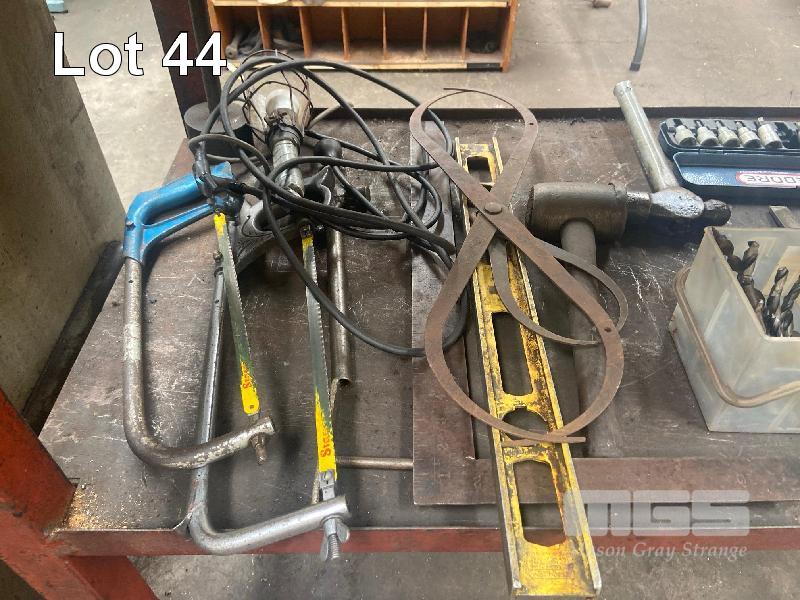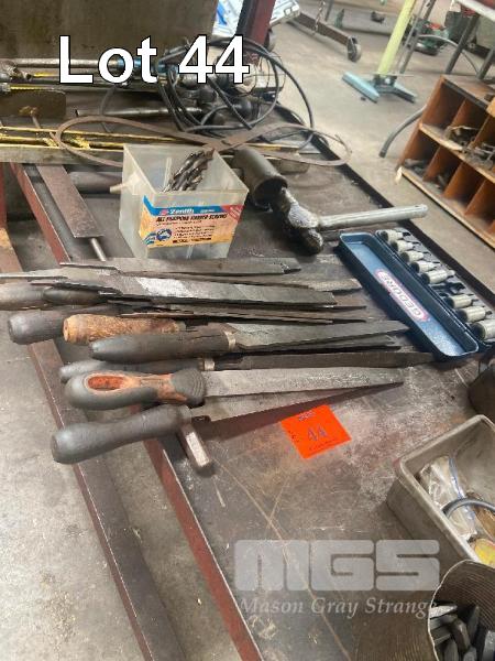 16 x ASSORTED HAND FILES & SOCKET SET . CALIPERS SPIRIT LEVEL AND MORE