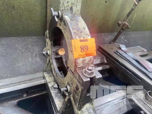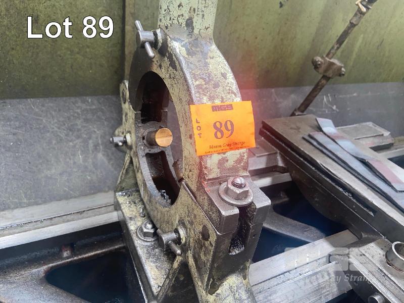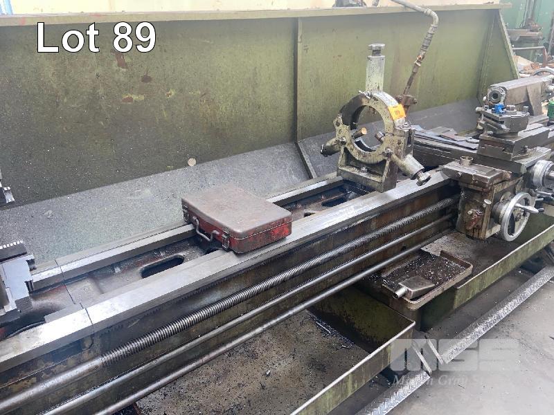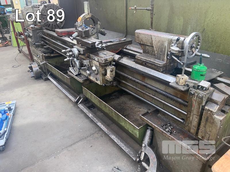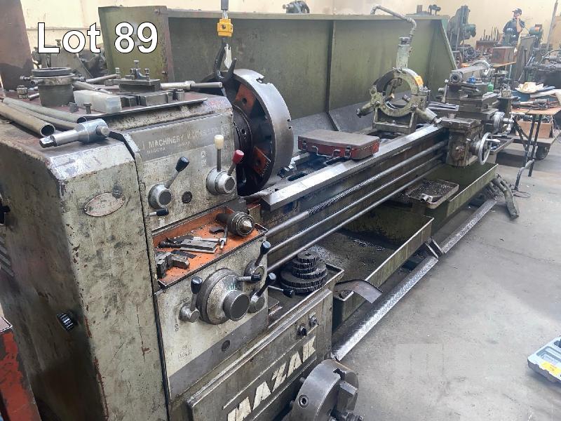 CENTRE LATHE, MAZAK 2500mm BC 800mm BORE QUICK CHANGE TOOL POST & HOLDER 450mm 4 JAW CHUCK 300mm 3 JAW CHUCK CHANGE GEARS 2 & 3 POINT STEADYS 415V WITH OHEAD POWERED LOADING HOIST ON SWIVEL BOOM.