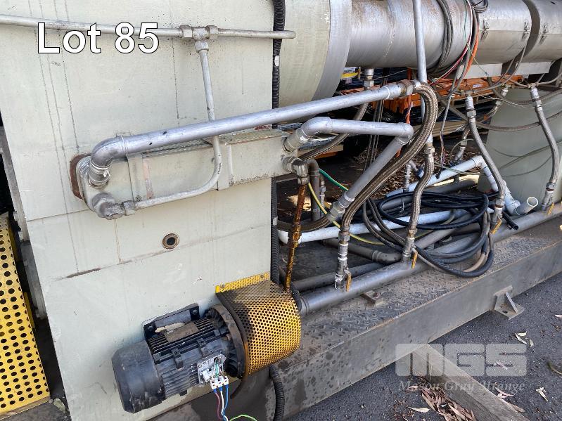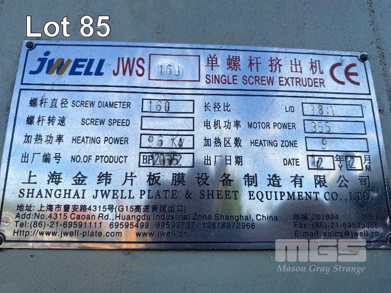 PLASTIC SCREW EXTRUSION MACHINE, SHANGHAI JWELL PLATE & SHEET CO MOD: JWS160 SINGLE SCREW EXTRUDER SCREW DIAMETER 160mm DRIVING POWER: 355kw HEATING POWER: 96kw DOM: 12/12 WITH SIEMENS SIMATIC MULTI PANEL CONTROLLER 415V