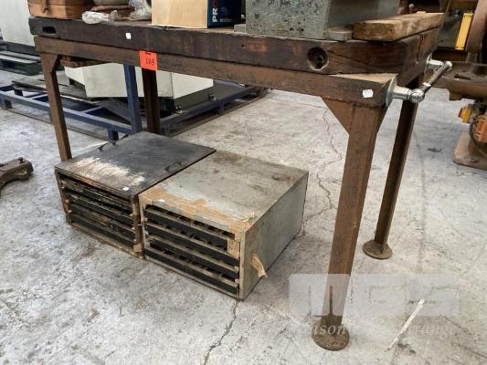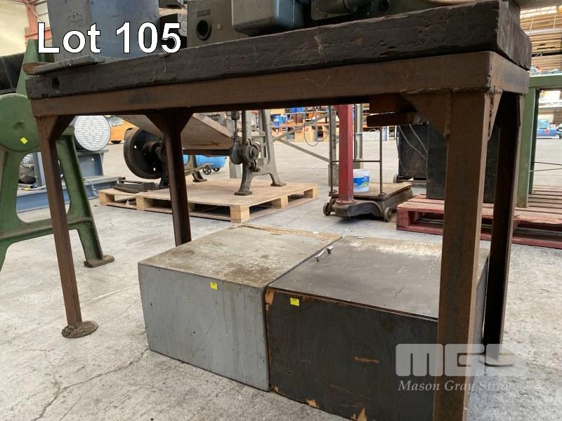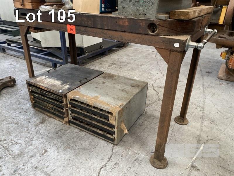 VINTAGE WORKSHOP BENCH, STEEL FRAME, HARDWOOD TOP