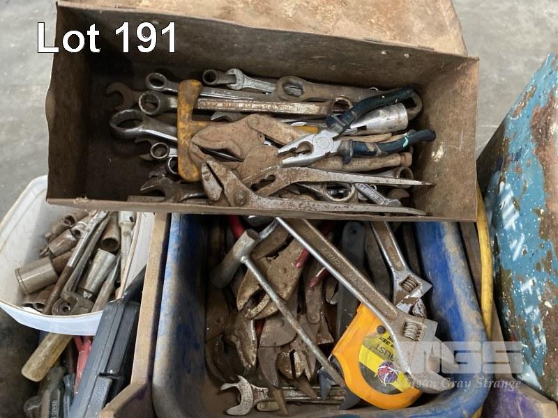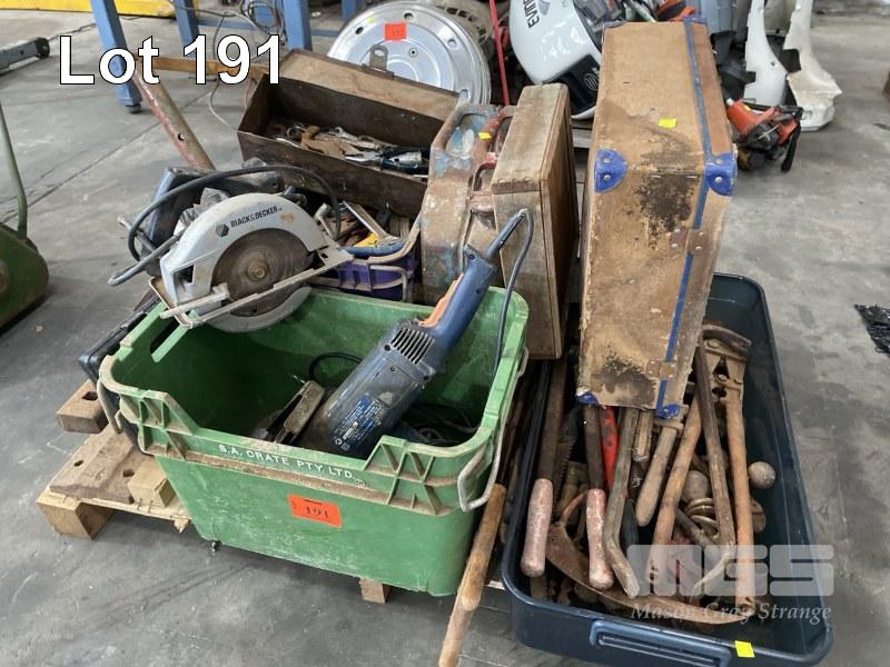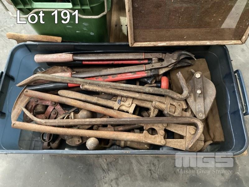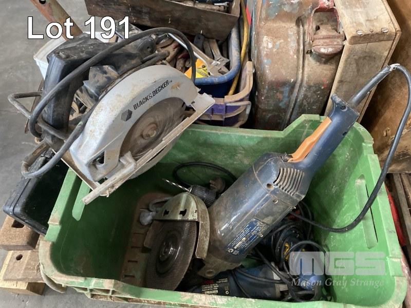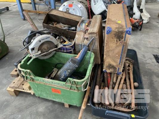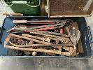 HAND TOOLS, SOCKETS, PIPE WRENCHES, BOLT CUTTERS, SAWS, RYOBI GRINDER, GMC DRILL & 9" GRINDER, B&D CIRCULAR SAW, VICE GRIPS, ETC